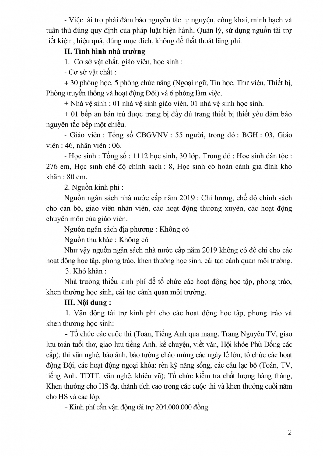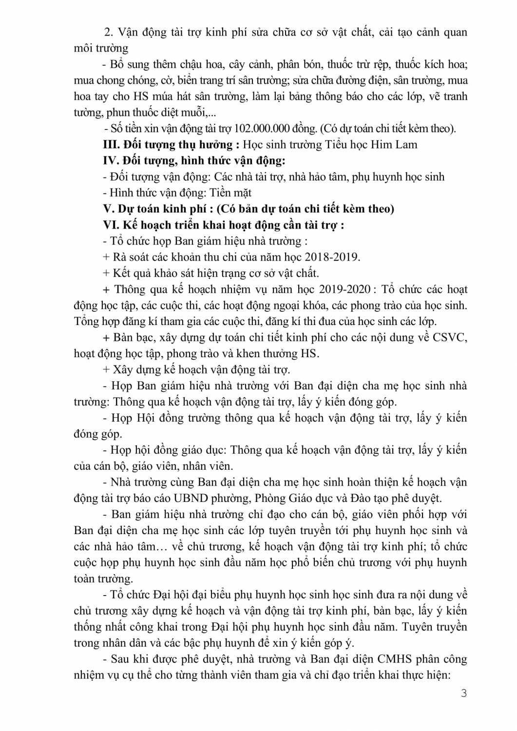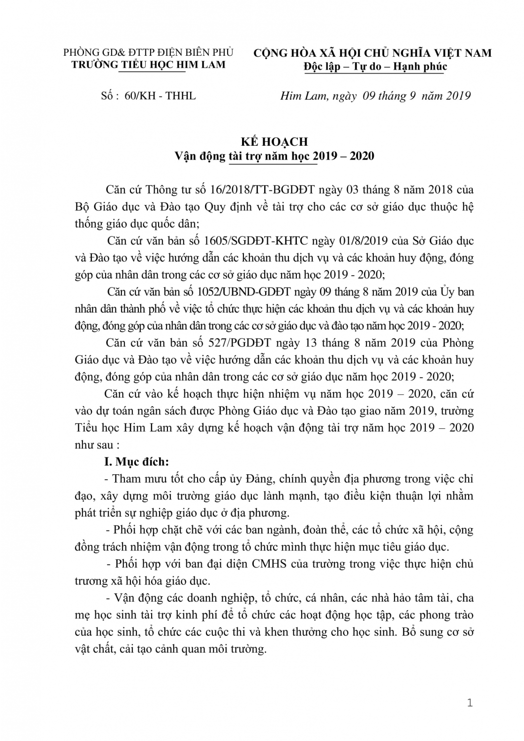 KẾ HOẠCH VẬN ĐỘNG TÀI TRỢ NĂM HỌC 2019-2020