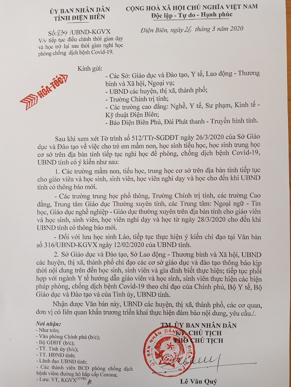 THÔNG BÁO CÔNG VĂN 834 CỦA UBND TỈNH ĐIỆN BIÊN VỀ VIỆC TIẾP TỤC ĐIỀU CHỈNH THỜI GIAN DẠY VÀ HỌC TRỞ LẠI SAU KHI NGHỈ CHỐNG DỊCH, BỆNH COVID - 19.