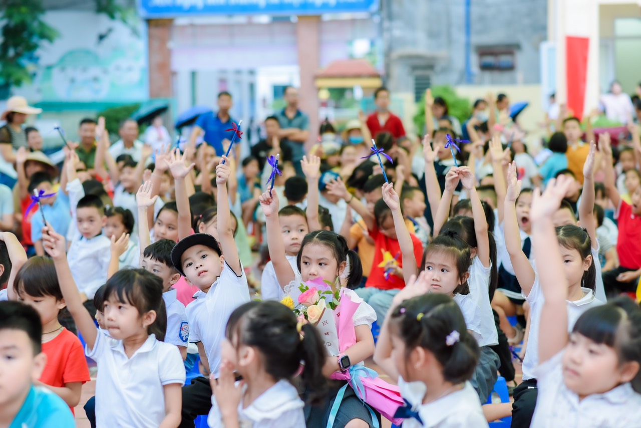 Ngay từ sáng sớm, các thầy cô giáo đã đứng ở cổng trường để đón và dắt từng học sinh vào hàng. Sau khi tập trung đông đủ các em được thưởng thức một chương trình văn nghệ do các bạn học sinh trong đội sơn ca của nhà trường biểu diễn. Năm học 2023-2024, nhà trường có 6 lớp 1 với 222 em học sinh. Nhà trường đã phân công 6 giáo viên giàu kinh nghiệm, có trình độ chuyên môn tốt, giàu lòng yêu thương, tận tâm với học sinh làm chủ nhiệm các lớp khối 1. Các em học sinh được xếp vào các lớp và nhận cô giáo chủ nhiệm của mình. Mỗi em học sinh được các thầy cô trong Ban Giám hiệu tặng một chiếc bút chì. Món quà tuy nhỏ nhưng là nguồn động viên khích lệ để các em học sinh có hứng thú đến trường. Có lẽ điều thú vị nhất với các em là được chơi các trò chơi và nhận những phần quà ý nghĩa.