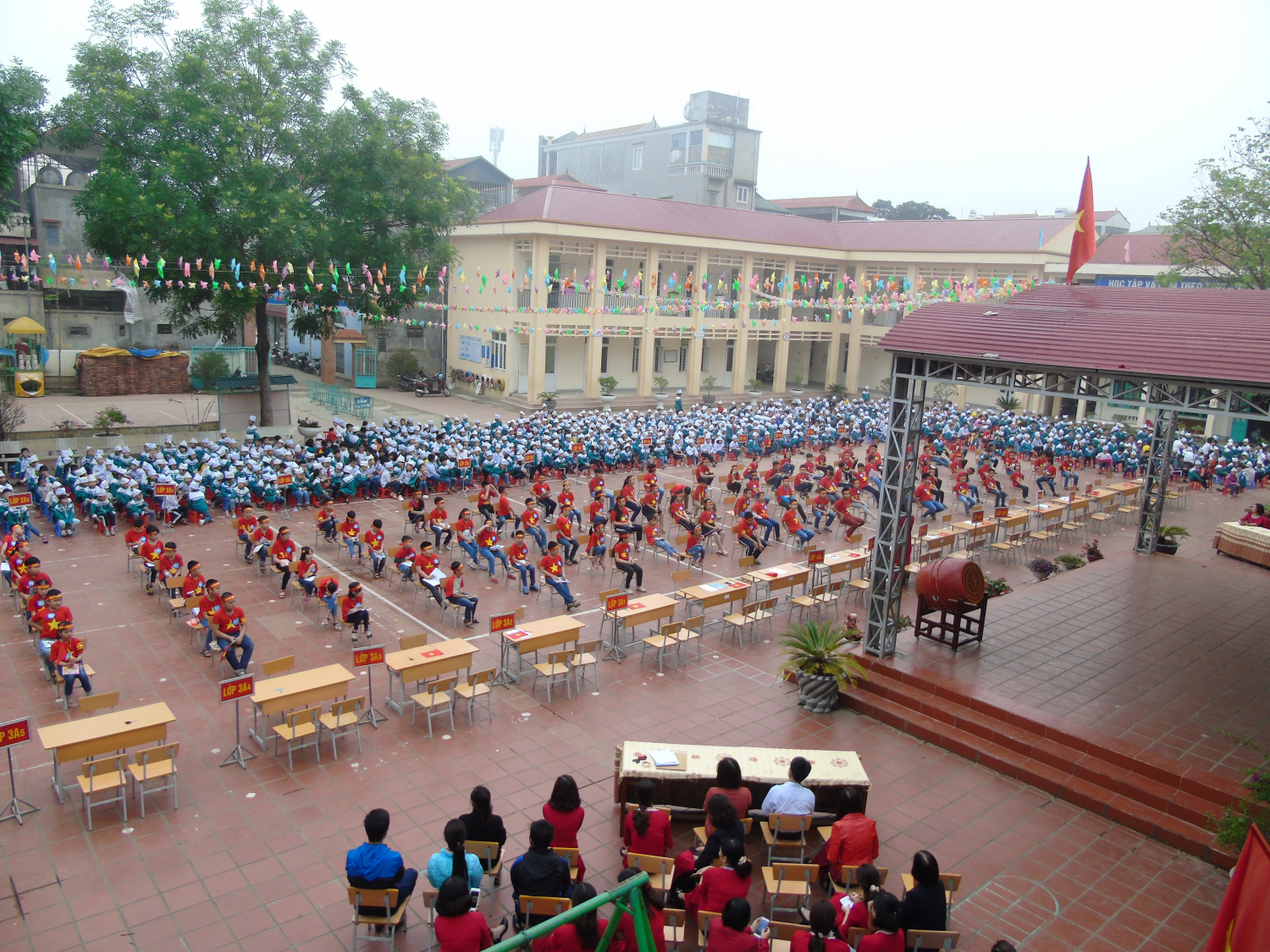 Trước sự cổ vũ nhiệt tình của các bạn học sinh toàn trường, các đội chơi đã tham gia phần thi đồng đội đầy hào hứng. Mỗi đội có 6 học sinh, lần lượt mỗi học sinh sẽ lên lựa chọn 1 trong 6 câu để trả lời bằng cách ghi đáp án. Khi bạn cuối cùng làm bài xong sẽ phất cờ để báo hiệu phần thi của đội mình kết thúc. Trong tiếng trống rộn ràng cùng lời hò hét cổ vũ náo nhiệt của các bạn cổ động viên song các thí sinh vẫn tập trung, bình tĩnh để làm bài.