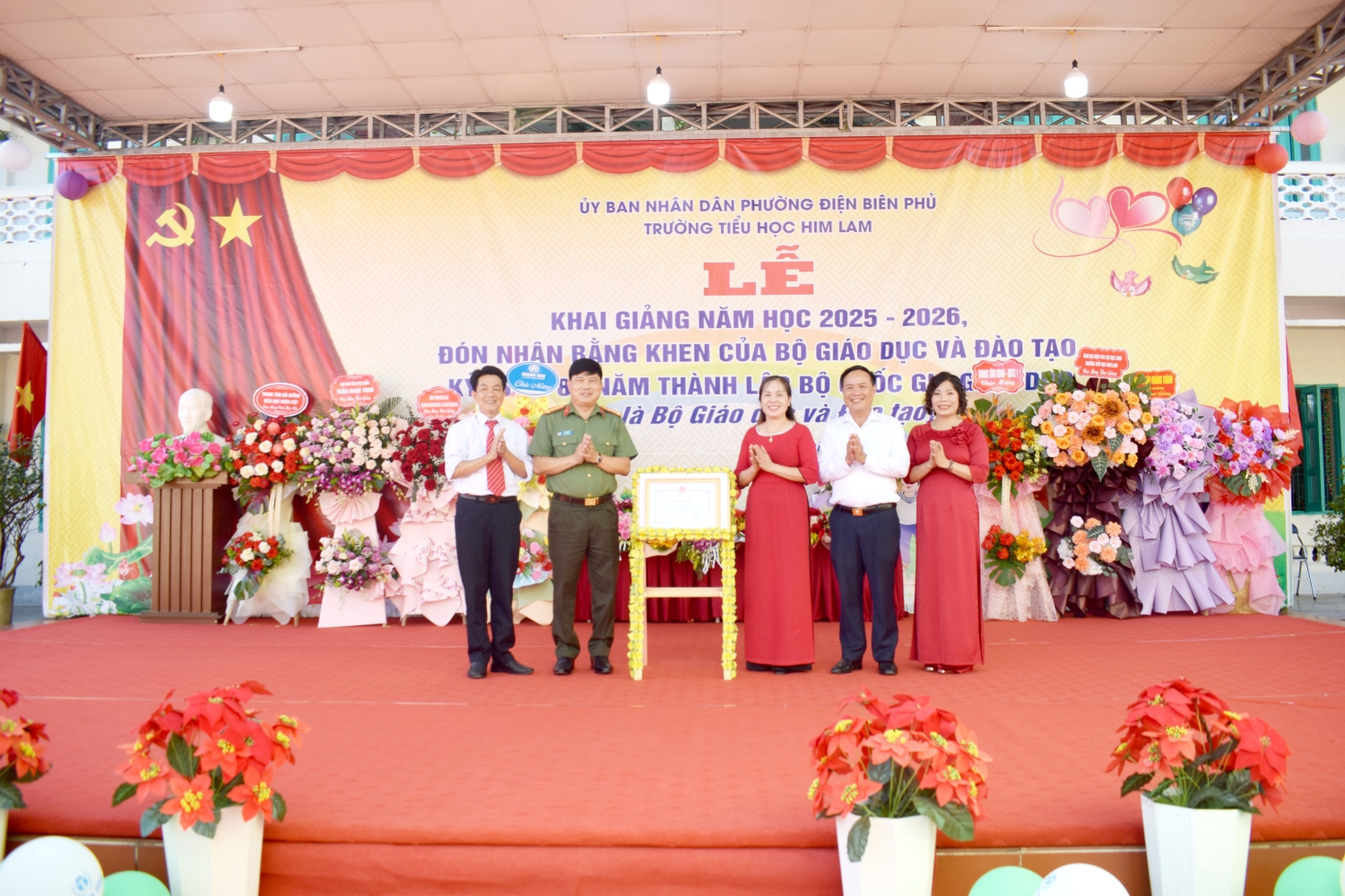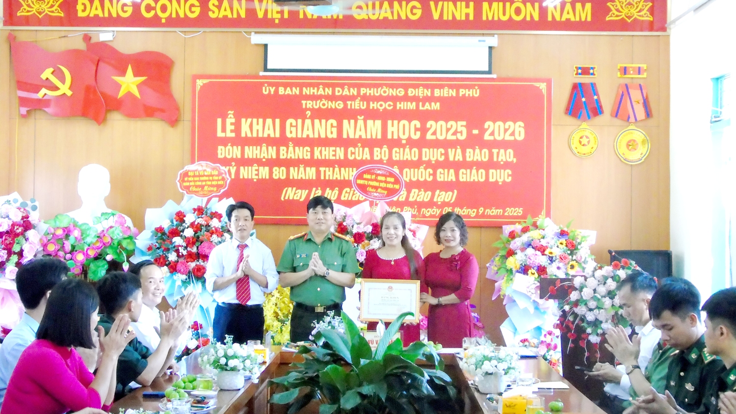 Tại buổi Lễ, đồng chí Đại tá Vũ Văn Đấu - Ủy viên Ban thường vụ Tỉnh ủy, Giám đốc Công an tỉnh Điện Biên thay mặt Lãnh đạo Tỉnh trao tặng Bằng khen của Bộ Giáo dục và Đào tạo cho tập thể nhà trường. Đây là phần thưởng cao quý, ghi nhận sự nỗ lực, phấn đấu và những thành tích đáng tự hào của tập thể nhà trường trong năm học 2024-2025.