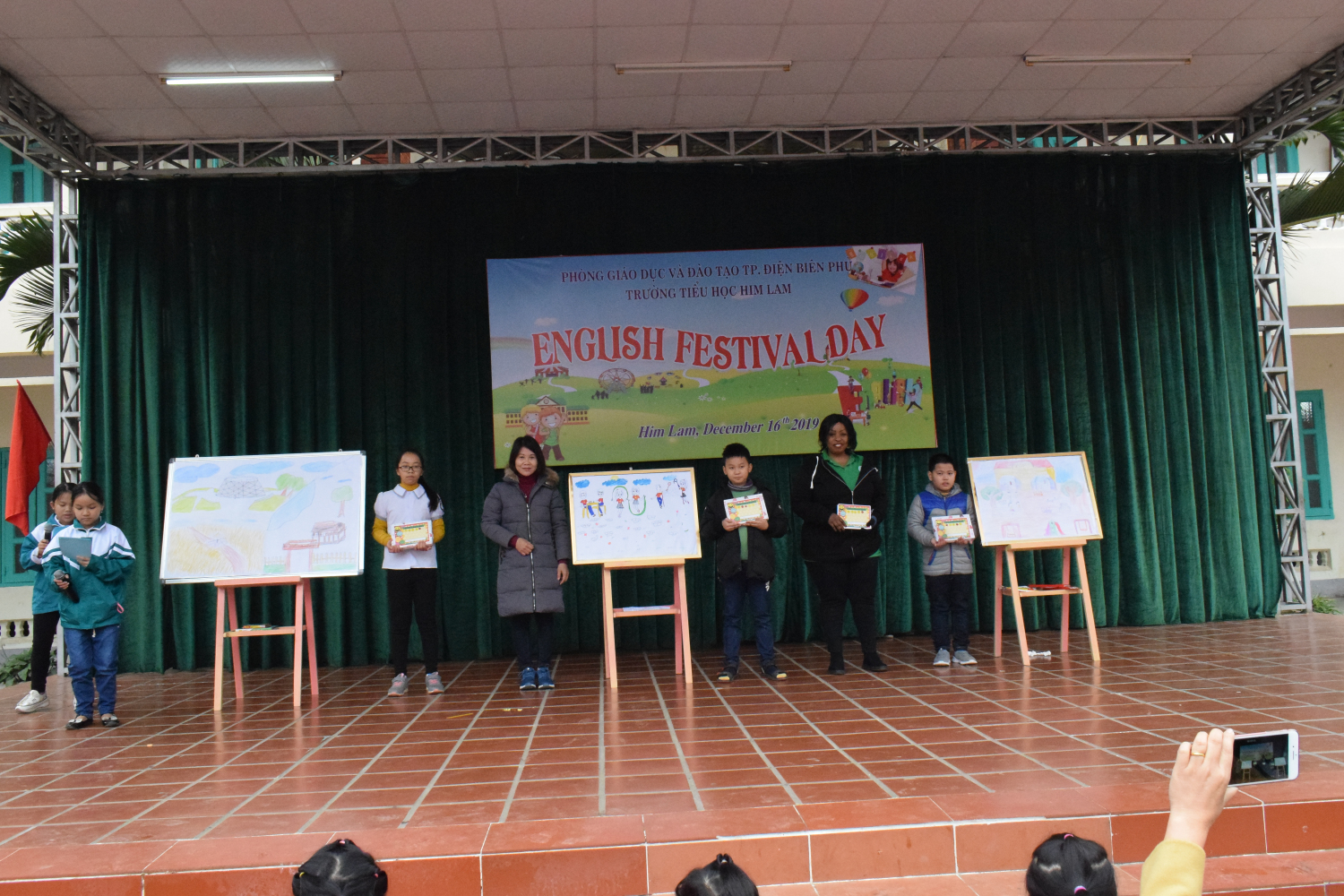 Hồi hộp nhất là phần trình diễn các bức tranh và thuyết trình bằng Tiếng Anh theo chủ đề của đại diện các bạn học sinh đến từ các khối lớp 3,4,5. Các bạn khối 3 vẽ bức tranh và giới thiệu về ngôi trường của em. Bức tranh của các bạn khối 4 là hình ảnh các hoạt động vui chơi của các bạn học sinh. Ấn tượng nhất là bức tranh của các bạn khối lớp 5 vẽ về quê hương Điện Biên Phủ anh hùng. Phần thuyết trình của các đội đã nhận được sự đánh giá cao của các bạn học sinh toàn trường. Thay mặt Ban giám hiệu, cô giáo Đinh Thị Thanh Nhàn - Bí thư chi bộ - Hiệu trưởng nhà trường đã trao quà lưu niệm cho các bạn học sinh tham gia giao lưu.