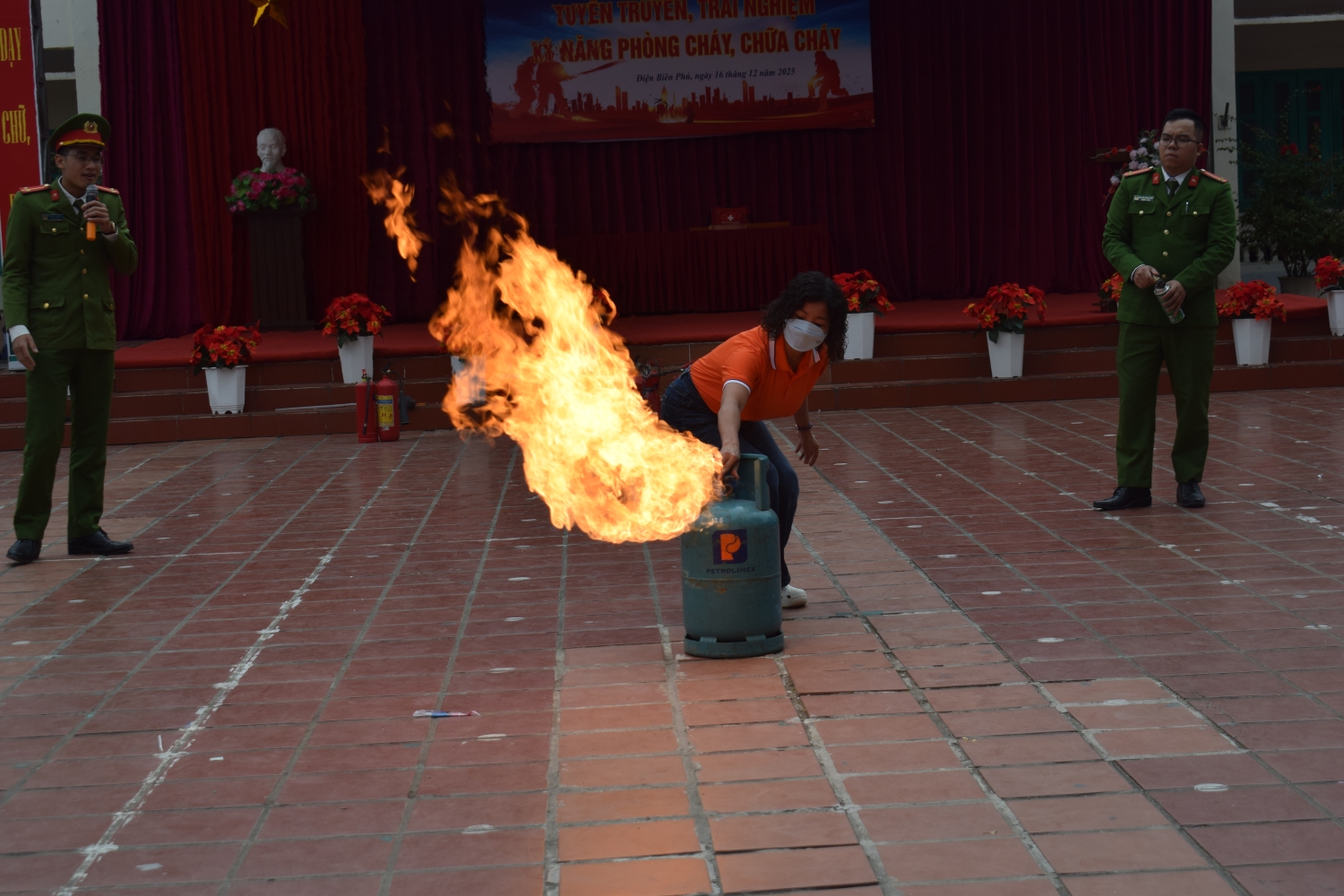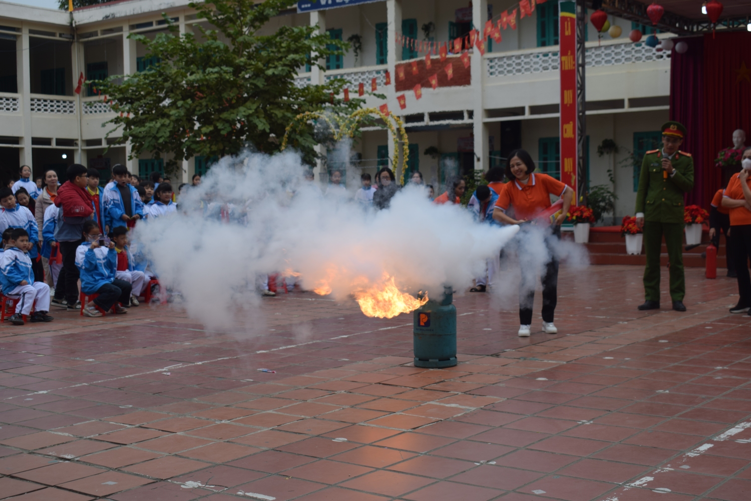 Phần thực hành trải nghiệm được tổ chức khoa học, an toàn với các nội dung: kỹ năng thoát nạn khi có cháy, kỹ năng cứu người bị nạn, thực hành sử dụng bình chữa cháy xách tay để dập tắt đám cháy giả định (cháy khí gas). Giáo viên và học sinh được trực tiếp hướng dẫn thao tác đúng kỹ thuật như: kiểm tra bình, rút chốt an toàn, hướng vòi phun vào gốc lửa và bóp van dập cháy, dưới sự giám sát chặt chẽ của lực lượng Cảnh sát PCCC.