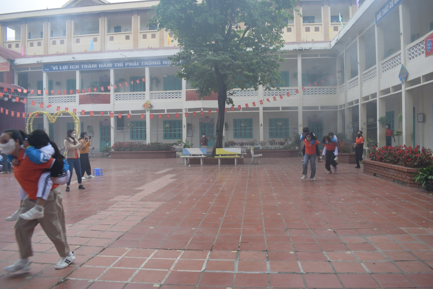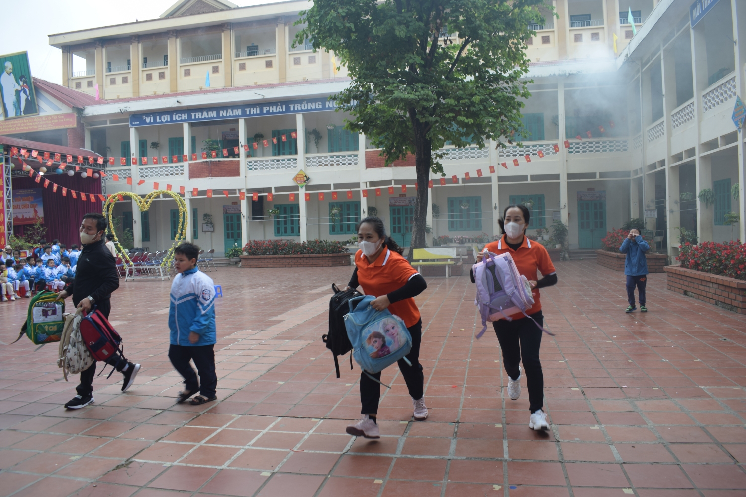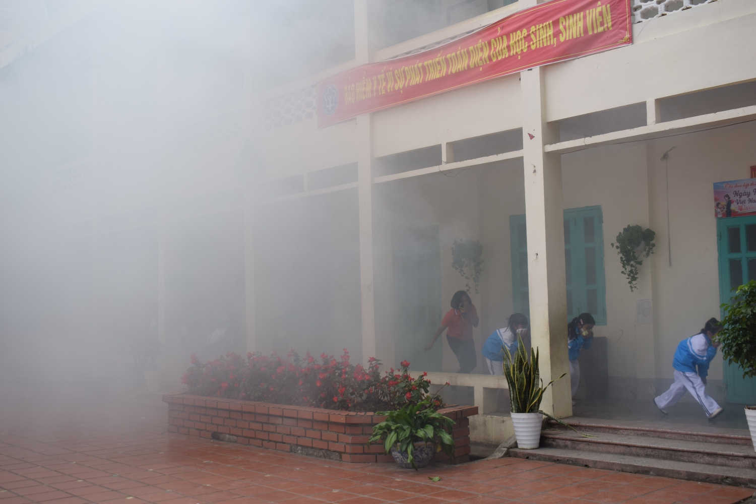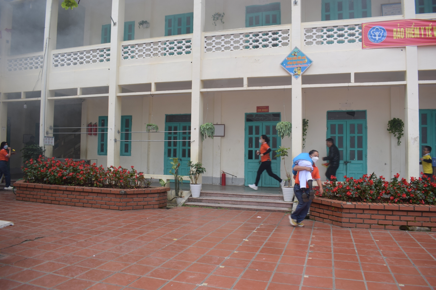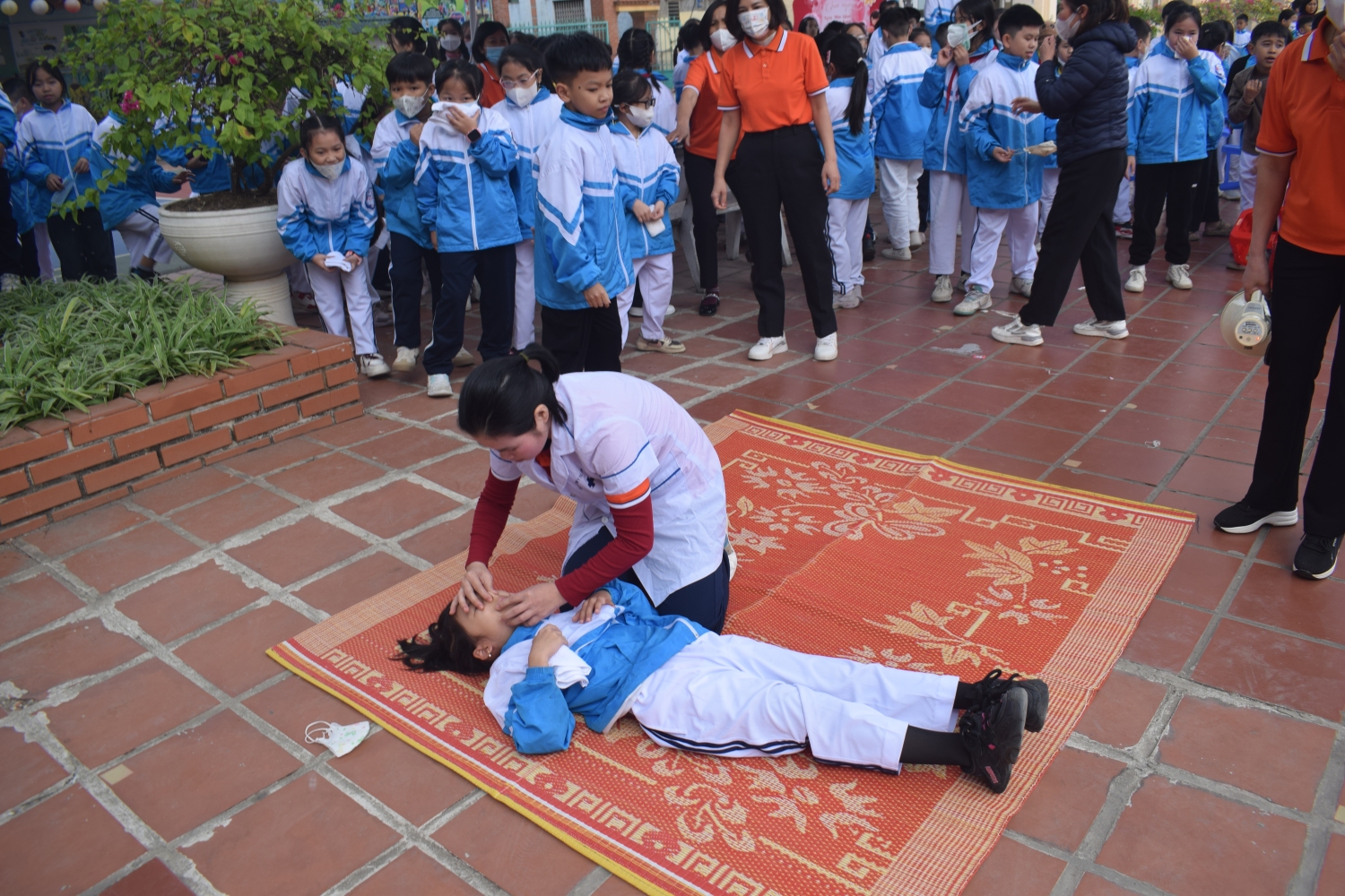Trong tình huống giả định cháy xảy ra tại lớp học, giáo viên đã tổ chức di chuyển an toàn 100 học sinh của lớp 3, 4, 5 ra khỏi khu vực nguy hiểm theo đúng quy trình thoát nạn: dùng khăn ướt che mũi, miệng, cúi thấp người và di chuyển theo lối thoát hiểm. Đặc biệt, tình huống giả định 05 học sinh bị ngạt khói đã được giáo viên và nhân viên y tế nhà trường phối hợp thực hiện sơ cứu ban đầu, hỗ trợ hô hấp, mang lại trải nghiệm thực tế, thiết thực cho cả thầy và trò.