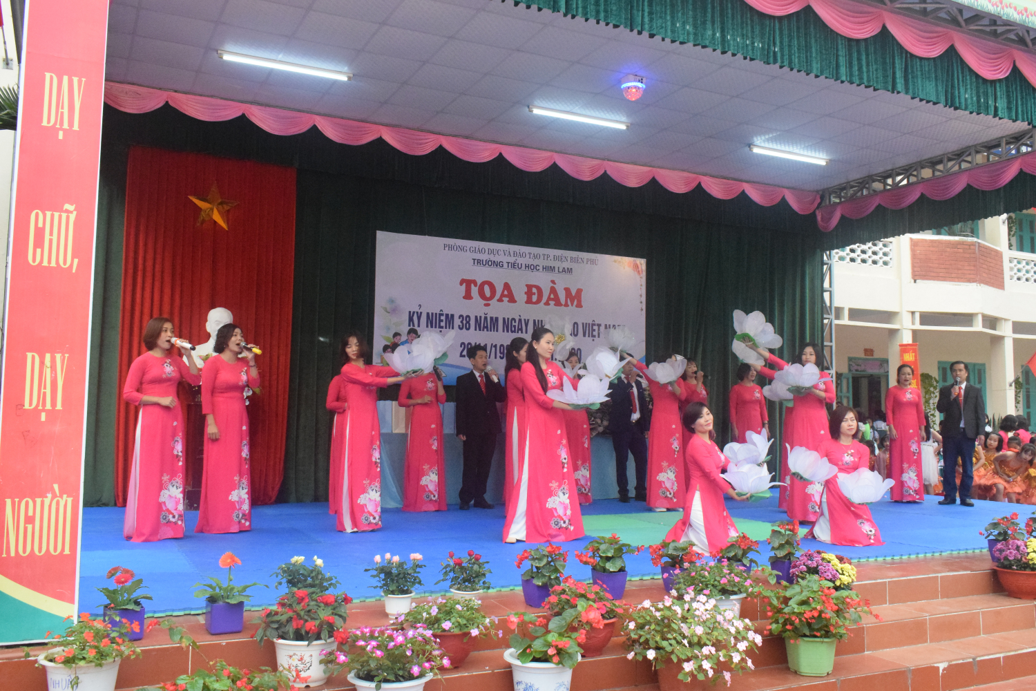 Rất vinh dự cho nhà trường được đón đoàn đại biểu lãnh đạo Thành ủy - HĐND – UBND, các phòng ban thành phố Điện Biên Phủ và lãnh đạo, chuyên viên Phòng giáo dục và đào tạo do đồng chí Lê Tiến Dũng - Tỉnh ủy viên – Phó Bí thư – Chủ tịch Ủy ban nhân dân thành phố Điện Biên Phủ làm trưởng đoàn đã đến chúc mừng, động viên thầy và trò nhà trường.