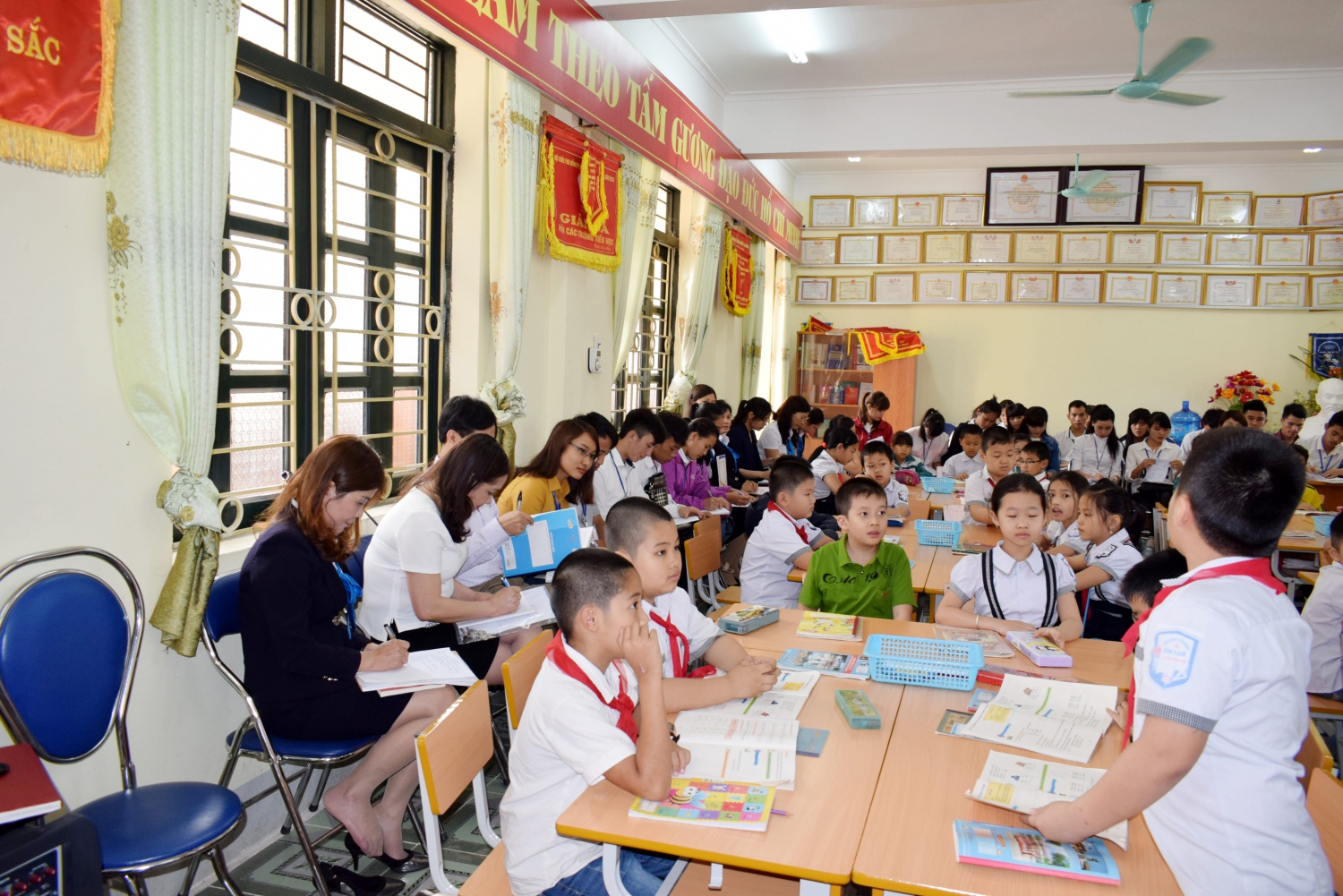 Thực hiện Kế hoạch dạy mẫu, sáng ngày 21/3/2017 trường tiểu học Him Lam đã tổ chức dạy mẫu môn Toán có sự tham gia của các thầy cô giáo tổ khối 2 -3 và 34 em sinh viên khóa 2015 – 2018 trường Cao đẳng Sư phạm Điện Biên. Tới dự có các đồng chí trong Ban giám hiệu nhà trường cùng các thầy cô giáo của khoa Giáo dục Tiểu học trường Cao đẳng sư phạm Điện Biên và toàn thể các đồng chí giáo viên tổ khối 2 - 3 nhà trường. Tham gia dạy chuyên đề là cô giáo Thẩm Thị Nga giáo viên tổ khối 2 - 3. Với sự chỉ đạo của Ban giám hiệu nhà trường, sự nỗ lực của bản thân cùng với sự chia sẻ đóng góp ý kiến của các thành viên trong tổ. Giờ học đã được diễn ra một cách thoải mái, nhẹ nhàng, học sinh nắm chắc kiến thức cơ bản về môn Toán lớp 3, kỹ năng so sánh các số trong phạm vi 100 000. Các em luôn được tham gia các hoạt động học tập một cách chủ động, tự tin; thông qua việc làm, các thao tác học, các em tự tìm ra và chiếm lĩnh tri thức, được phát huy khả năng tư duy và năng lực tối ưu của mình. Qua tiết dạy các em giáo sinh thực hành Sư phạm đã bước đầu nắm được quy trình các bước dạy toán lớp 3 theo mô hình trường Tiểu học mới VNEN. Một số hình ảnh của giờ dạy mẫu