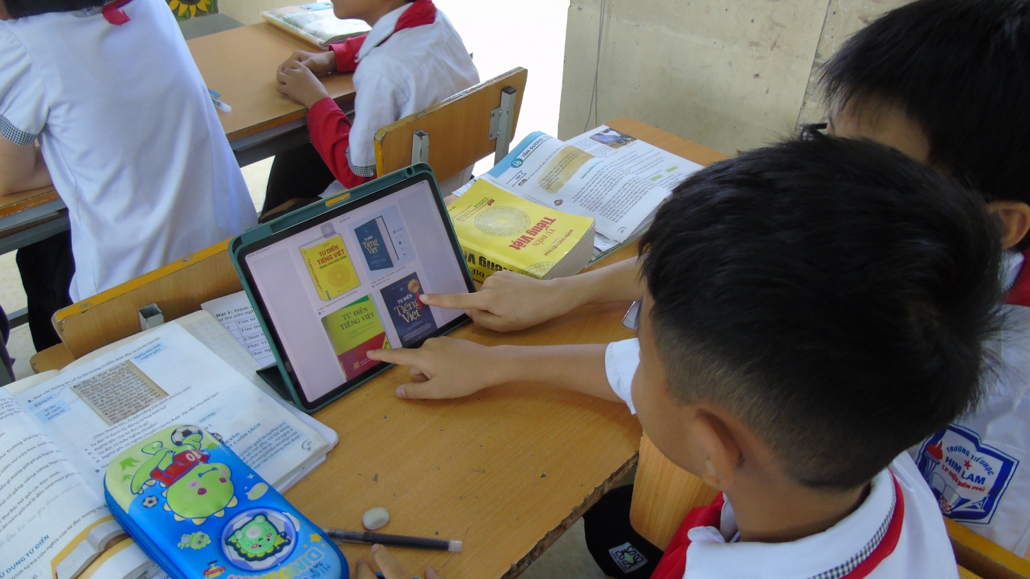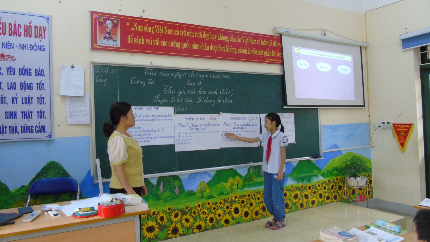 Với tinh thần đổi mới, tiết học đã mang đến cho học sinh một không gian học tập sáng tạo. Giáo viên đã vận dụng linh hoạt phương pháp dạy học, kết hợp ƯDCNTT để tổ chức trò chơi Plickers trong kiểm tra bài cũ, giúp học sinh ghi nhớ lại kiến bài học trước. Phần khám phá kiến thức giáo viên tổ chức cho học sinh thảo luận nhóm để các em biết sử dụng từ điển, biết đọc chữ viết tắt, biết tìm từ và tra nghĩa của từ, cụm từ trong quyển từ điển Tiếng Việt. Ngoài ra, giáo viên còn tổ chức cho các nhóm tra cứu nghĩa của từ trực tuyến trên internet bằng ipad và máy tính, Các em đã rất hào hứng tham gia học tập. Qua tiết học giúp học sinh nâng cao kĩ năng tìm hiểu từ điển, ứng dụng vào thực tiễn.