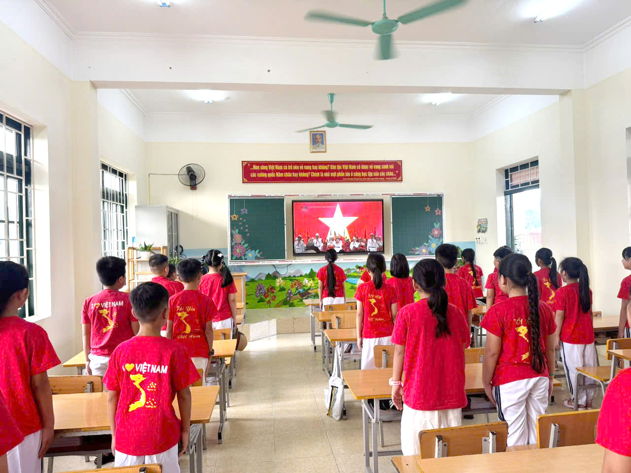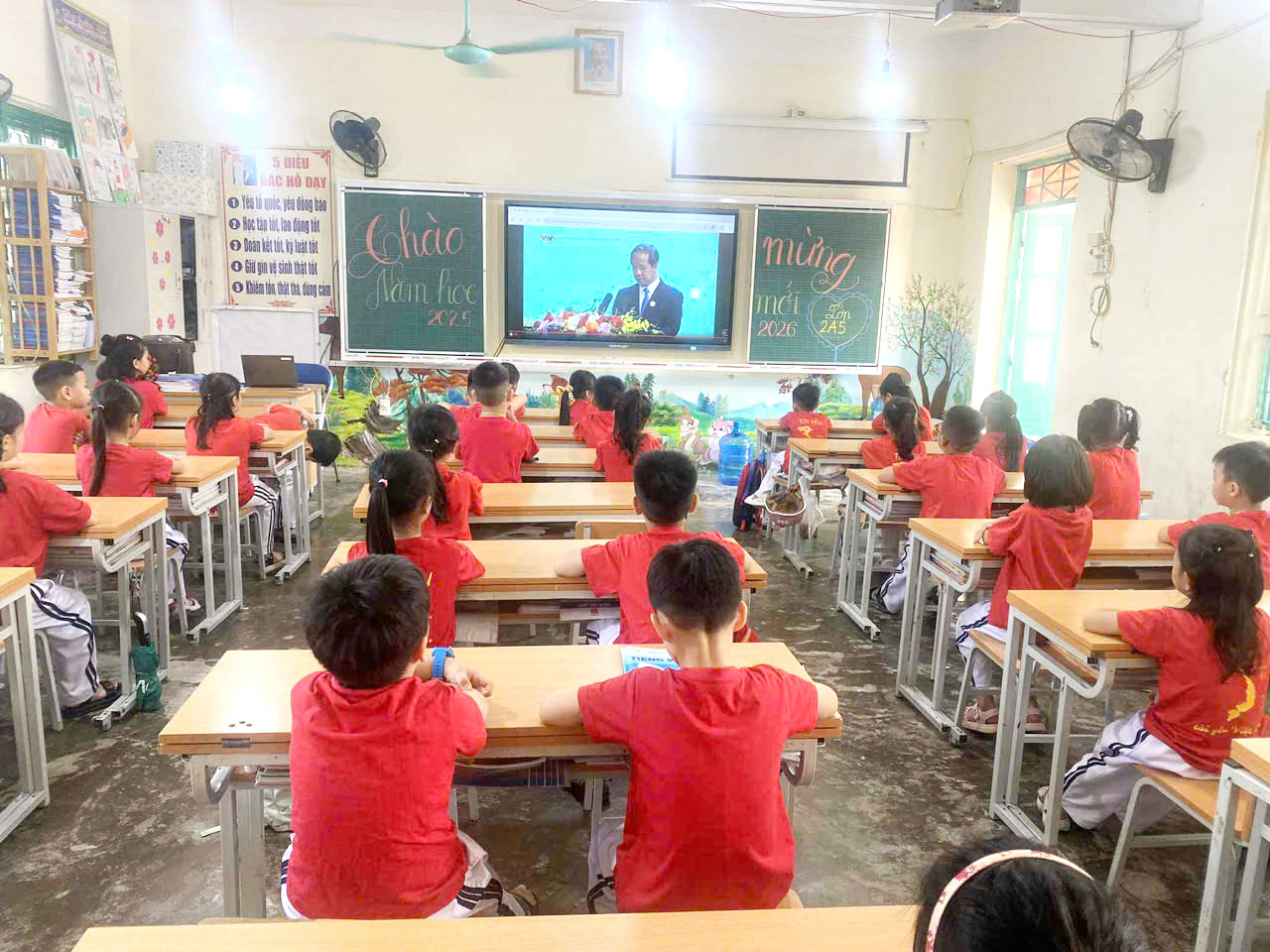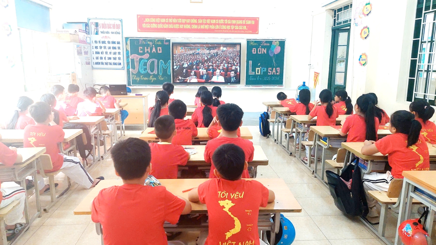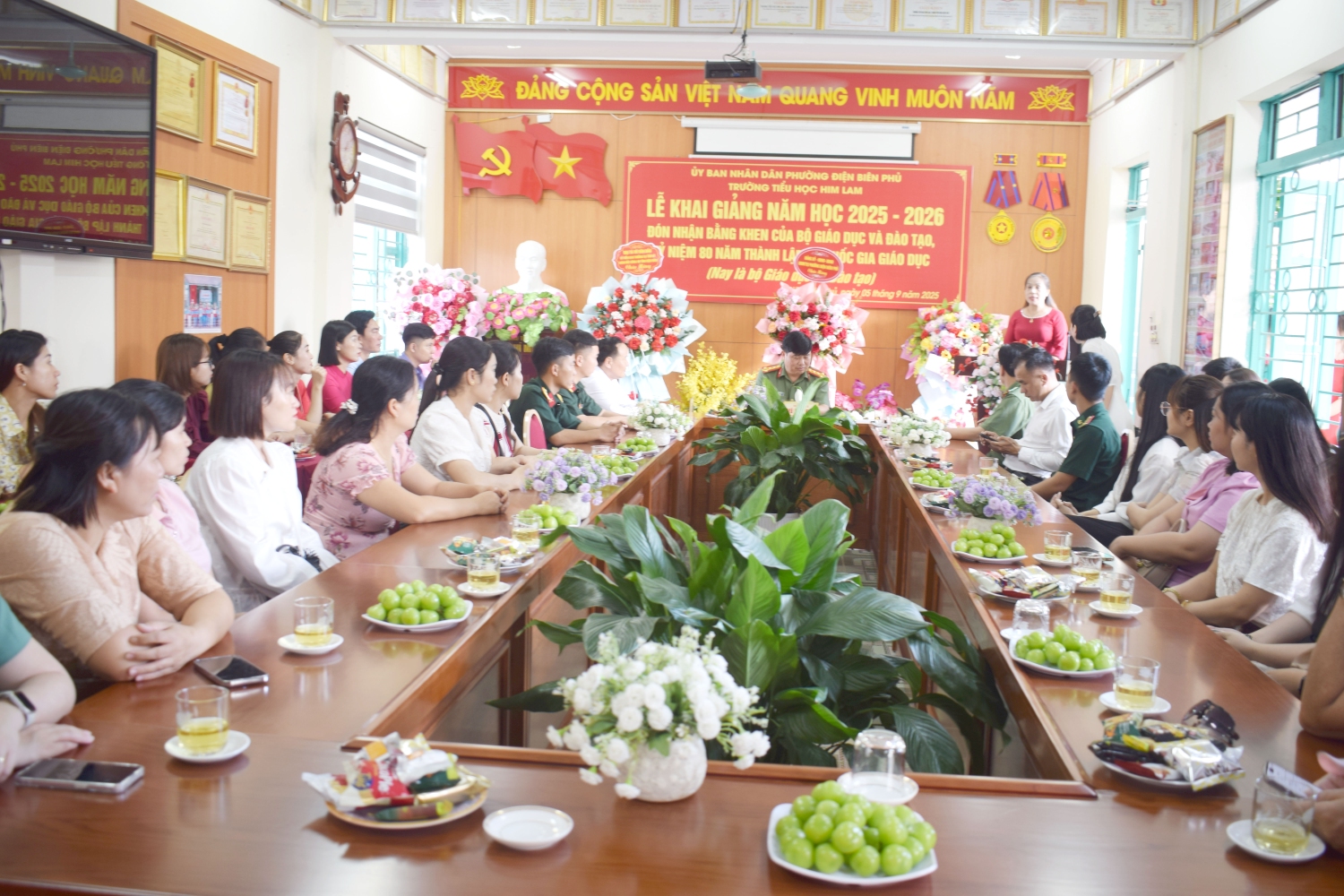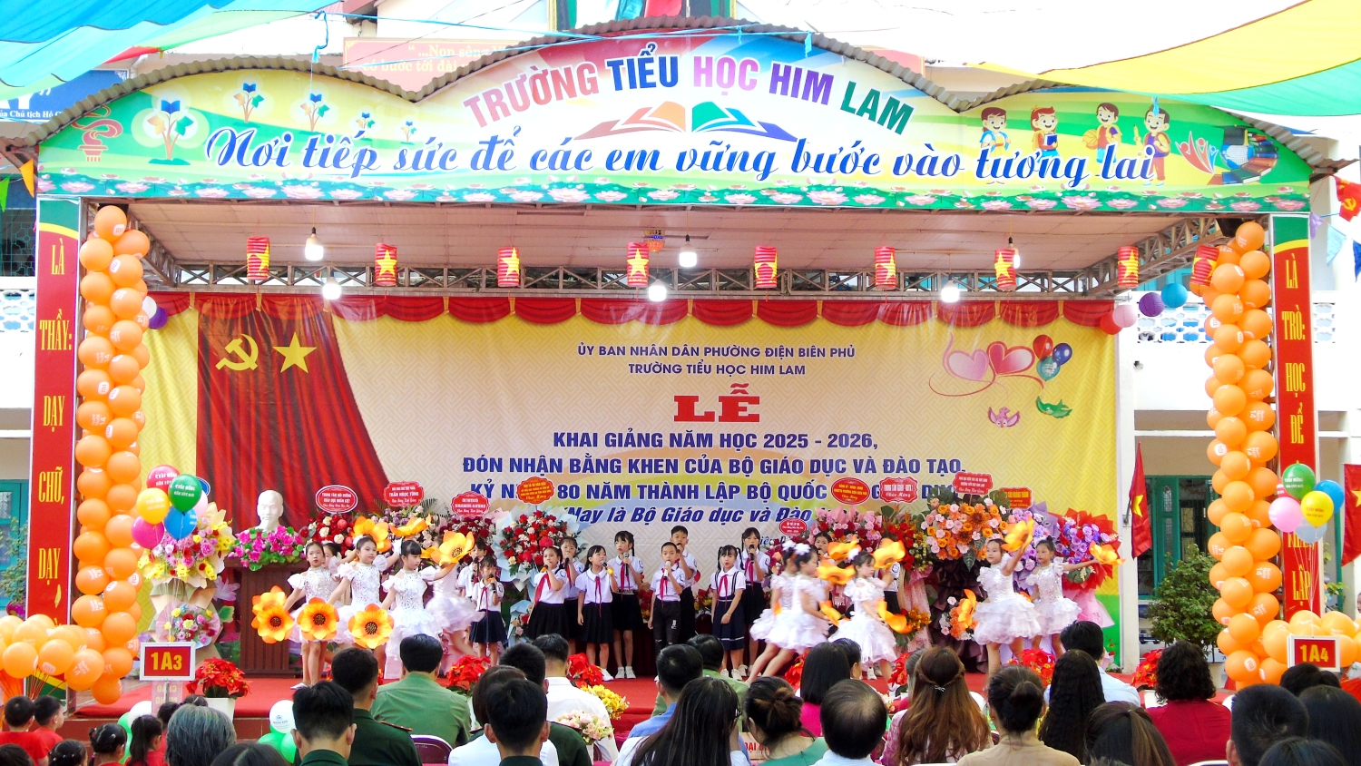 Sau chương trình văn nghệ, đúng 8 giờ, quý vị đại biểu, khách quý và toàn thể các thầy cô giáo và các em học sinh cùng tham dự trực tuyến Lễ khai giảng đặc biệt gắn với kỷ niệm 80 năm thành lập Bộ Quốc gia Giáo dục (Nay là Bộ Giáo dục và Đào tạo) do Bộ GD&ĐT tổ chức. Thầy trò nhà trường được thưởng thức chương trình văn nghệ đặc sắc, cùng hát vang bài Quốc ca hùng tráng với thầy trò các trường trên mọi miền của Tổ quốc, cùng nghe diễn văn của Bộ trưởng Bộ GD&ĐT Nguyễn Kim Sơn, xem phim tư liệu “80 năm Giáo dục phát triển đất nước”, nghe Tổng Bí Thư Tô Lâm phát biểu chỉ đạo và đánh trống khai trường. Buổi Lễ là dịp ôn lại truyền thống vẻ vang của ngành Giáo dục qua 80 năm xây dựng và phát triển, tôn vinh những đóng góp to lớn của các thế hệ nhà giáo, đồng thời khẳng định quyết tâm tiếp tục đổi mới, nâng cao chất lượng giáo dục trong giai đoạn mới. Thông qua sự kiện, mỗi thầy cô giáo trường Tiểu học Him Lam thêm tự hào về nghề, thêm động lực để cống hiến, góp phần xây dựng trường Tiểu học Him Lam ngày càng vững mạnh, đóng góp vào sự phát triển của sự nghiệp giáo dục địa phương và đất nước.