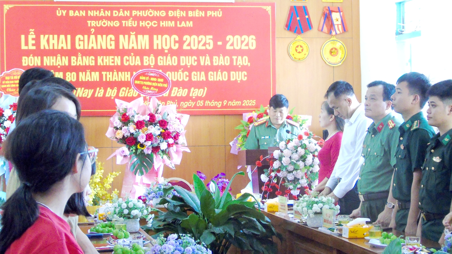Cũng tại buổi Lễ, Đồng chí Đại tá Vũ Văn Đấu - Ủy viên Ban thường vụ Tỉnh ủy, Giám đốc Công an tỉnh Điện Biên, đồng chí Trần Hữu Năm – Phó Bí thư Thường trực Đảng uỷ, Bí thư Đảng uỷ các cơ quan Đảng phường Điện Biên Phủ đã trao tặng những lẵng hoa tươi thắm và những phần quà ý nghĩa chúc mừng thầy trò nhà trường nhân dịp năm học mới. Thầy trò nhà trường còn được đón nhận những bó hoa tươi thắm, những tình cảm đặc biệt của các vị đại biểu Sở Giáo dục và Đào tạo, đơn vị kêt nghĩa, các cơ quan, ban ngành trên dịa bàn và các bậc phụ huynh. Đây là nguồn động viên to lớn, thể hiện sự quan tâm sâu sắc của các cấp lãnh đạo và chính quyền địa phương đối với sự nghiệp giáo dục và tình cảm ấm áp của quý đại biểu, quý phụ huynh dành cho tập thể nhà trường.