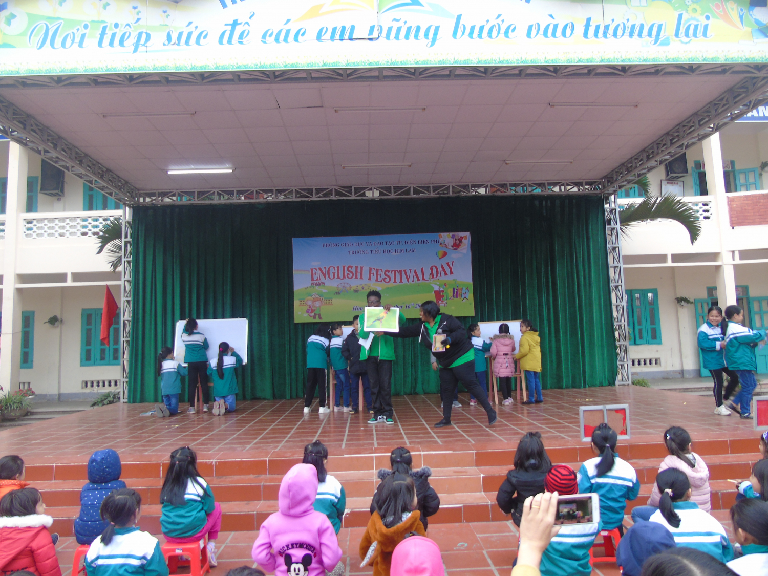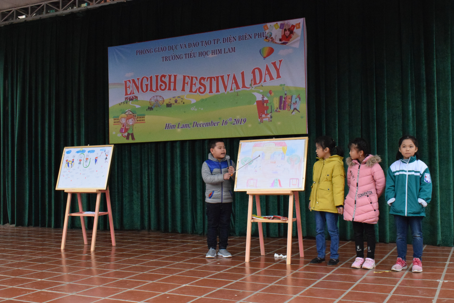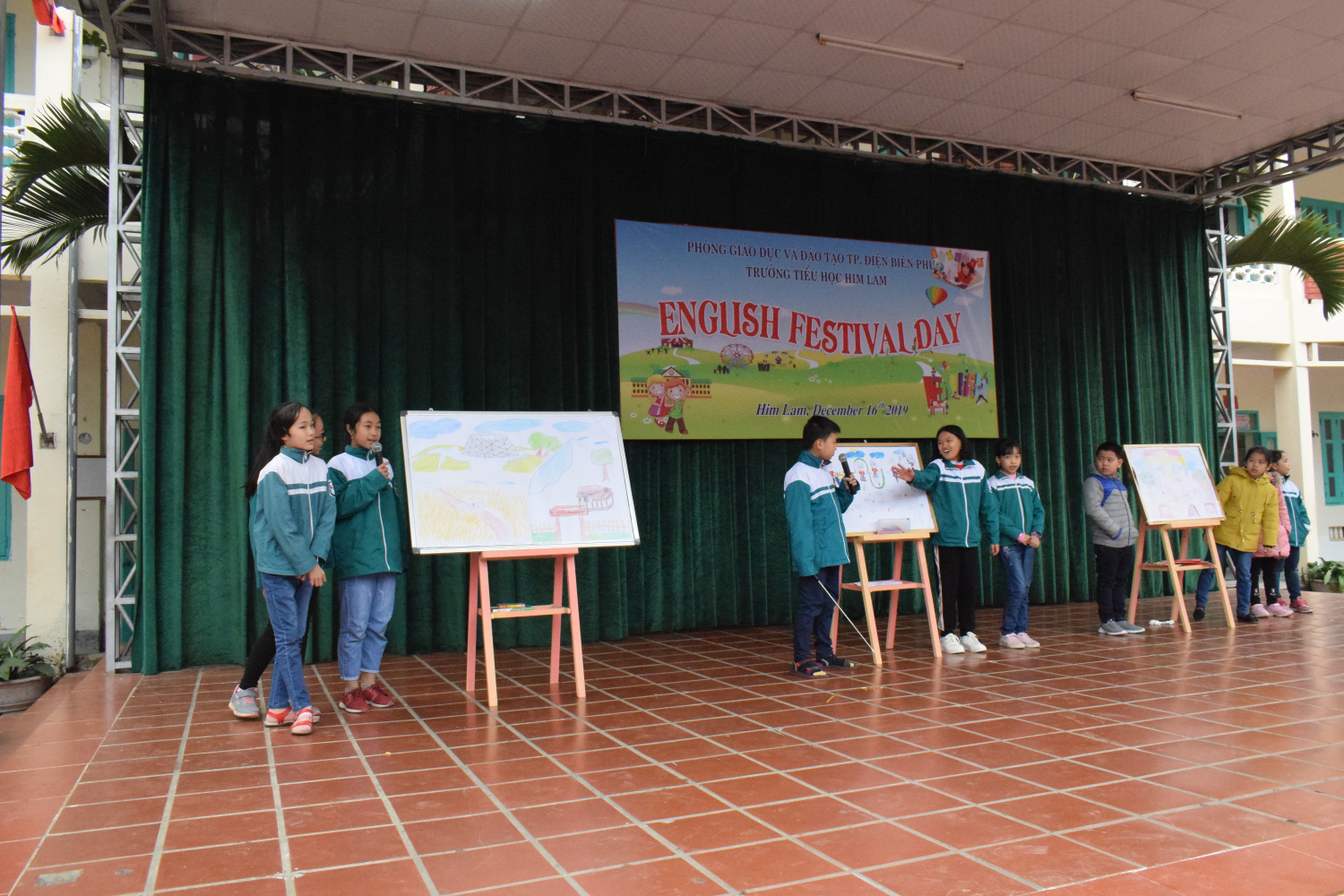 Hồi hộp nhất là phần trình diễn các bức tranh và thuyết trình bằng Tiếng Anh theo chủ đề của đại diện các bạn học sinh đến từ các khối lớp 3,4,5. Các bạn khối 3 vẽ bức tranh và giới thiệu về ngôi trường của em. Bức tranh của các bạn khối 4 là hình ảnh các hoạt động vui chơi của các bạn học sinh. Ấn tượng nhất là bức tranh của các bạn khối lớp 5 vẽ về quê hương Điện Biên Phủ anh hùng. Phần thuyết trình của các đội đã nhận được sự đánh giá cao của các bạn học sinh toàn trường. Thay mặt Ban giám hiệu, cô giáo Đinh Thị Thanh Nhàn - Bí thư chi bộ - Hiệu trưởng nhà trường đã trao quà lưu niệm cho các bạn học sinh tham gia giao lưu.
