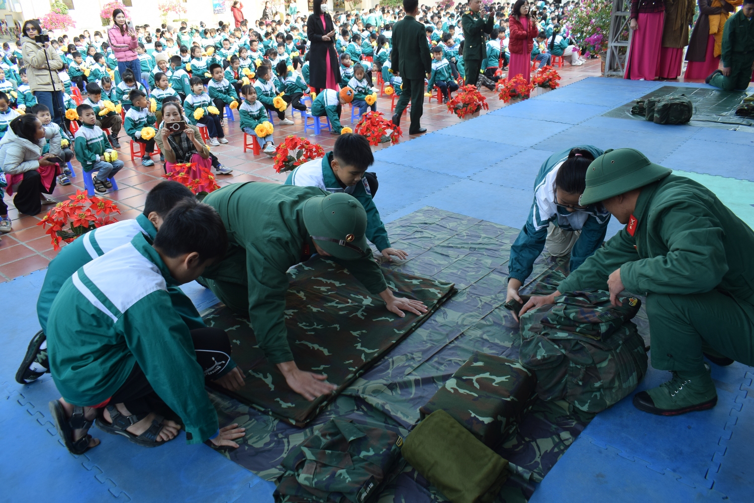 Cũng trong chương trình các em học sinh được tìm hiểu truyền thống hào hùng, vẻ vang của Quân đội Nhân dân Việt Nam; tìm hiểu về kỷ luật sinh hoạt nơi doanh trại, tinh thần huấn luyện, vượt gian khó trên thao trường của các chú bộ đội Đại đội 14- Trung đoàn 82 đơn vị kết nghĩa với nhà trường. Đặc biệt các em còn được tham gia thực hành trải nghiệm gấp chăn màn, quần áo và thực hành một số động tác huấn luyện trong quân ngũ như: trườn, bò, …. dưới sự hướng dẫn tỉ mỉ của các chú bộ đội. Các em học sinh đã vô cùng chăm chú, hào hứng và ai cũng muốn được tham gia.