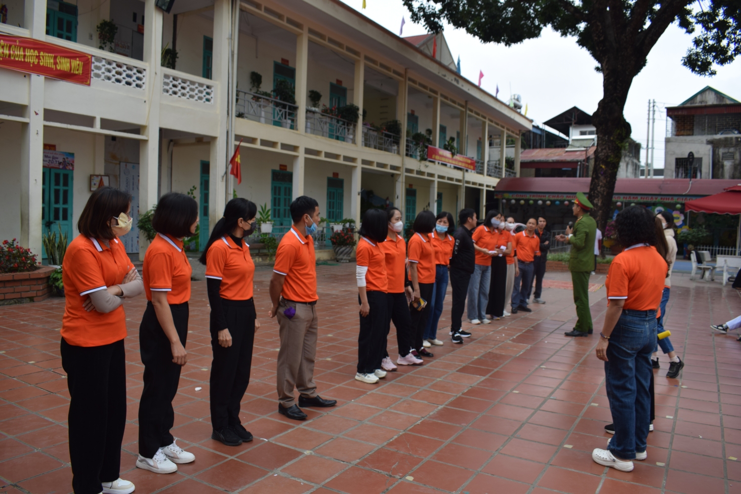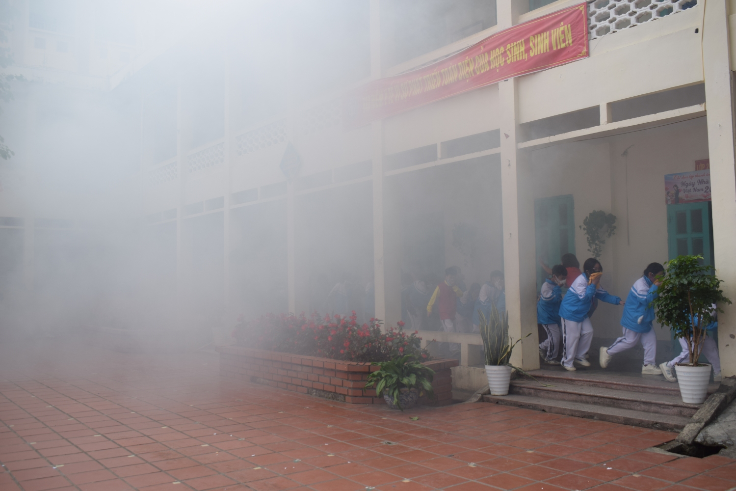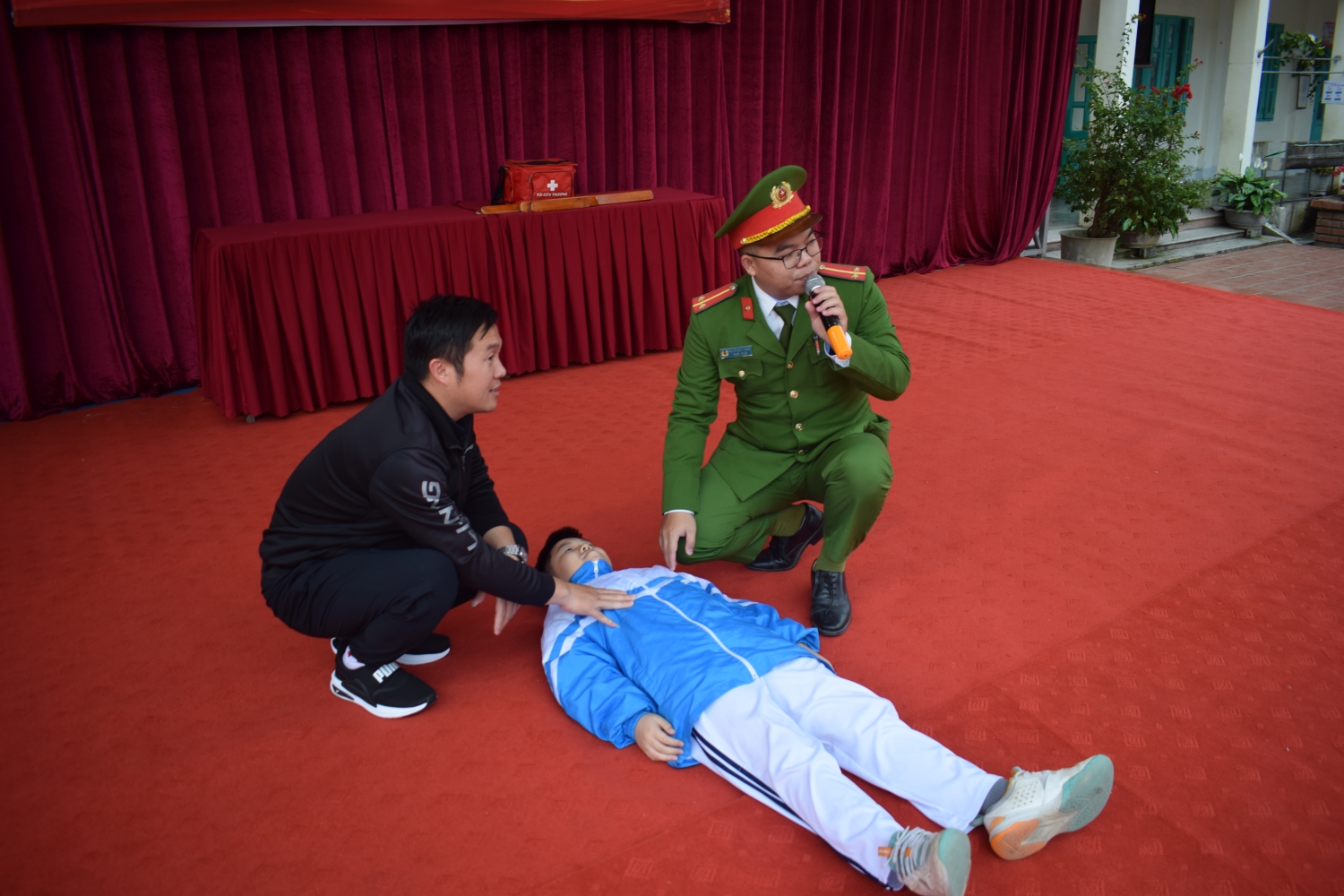 Trong tình huống giả định cháy xảy ra tại lớp học, giáo viên đã tổ chức di chuyển an toàn 100 học sinh của lớp 3, 4, 5 ra khỏi khu vực nguy hiểm theo đúng quy trình thoát nạn: dùng khăn ướt che mũi, miệng, cúi thấp người và di chuyển theo lối thoát hiểm. Đặc biệt, tình huống giả định 05 học sinh bị ngạt khói đã được giáo viên và nhân viên y tế nhà trường phối hợp thực hiện sơ cứu ban đầu, hỗ trợ hô hấp, mang lại trải nghiệm thực tế, thiết thực cho cả thầy và trò.