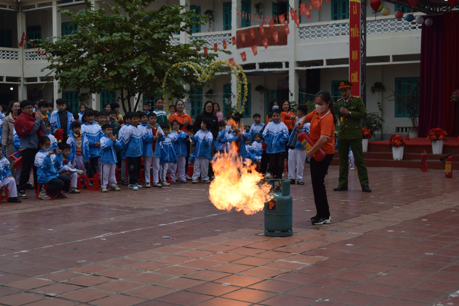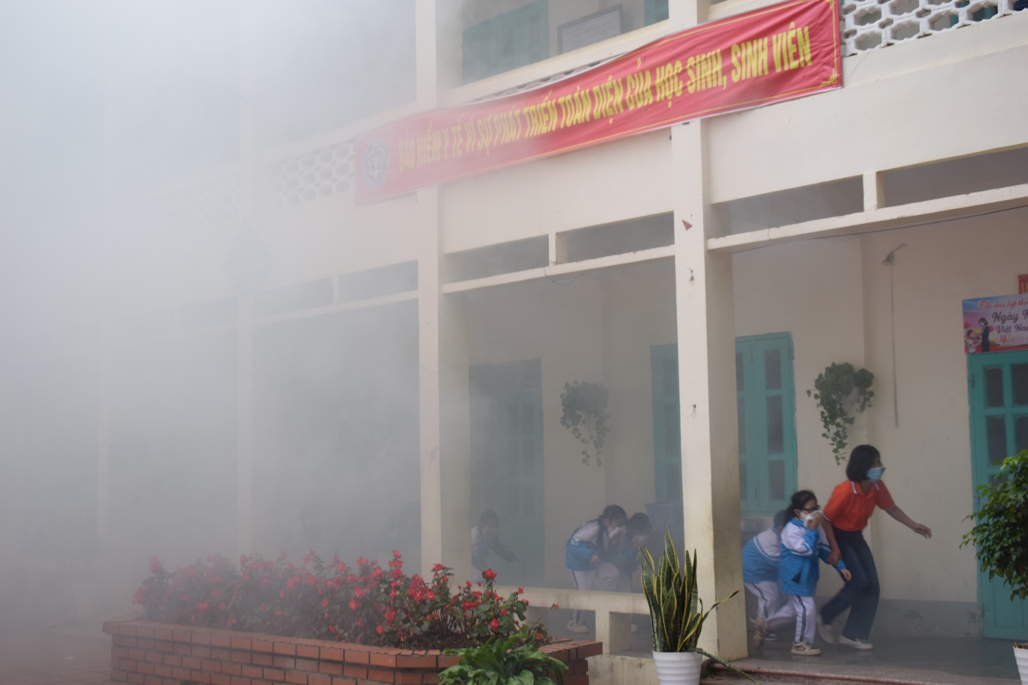 Phần thực hành trải nghiệm được tổ chức khoa học, an toàn với các nội dung: kỹ năng thoát nạn khi có cháy, kỹ năng cứu người bị nạn, thực hành sử dụng bình chữa cháy xách tay để dập tắt đám cháy giả định (cháy khí gas). Giáo viên và học sinh được trực tiếp hướng dẫn thao tác đúng kỹ thuật như: kiểm tra bình, rút chốt an toàn, hướng vòi phun vào gốc lửa và bóp van dập cháy, dưới sự giám sát chặt chẽ của lực lượng Cảnh sát PCCC.