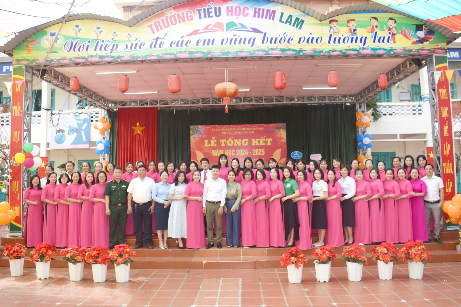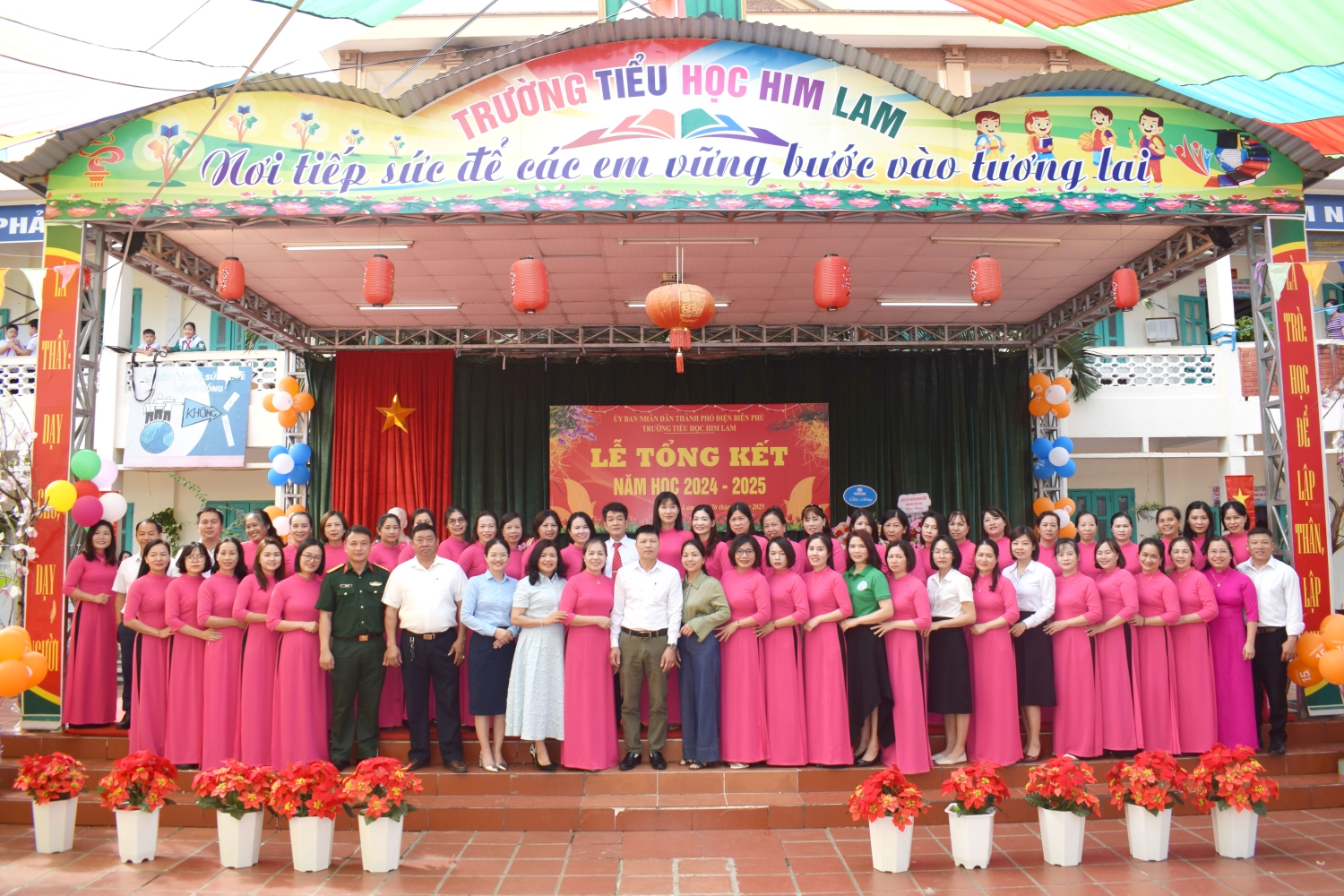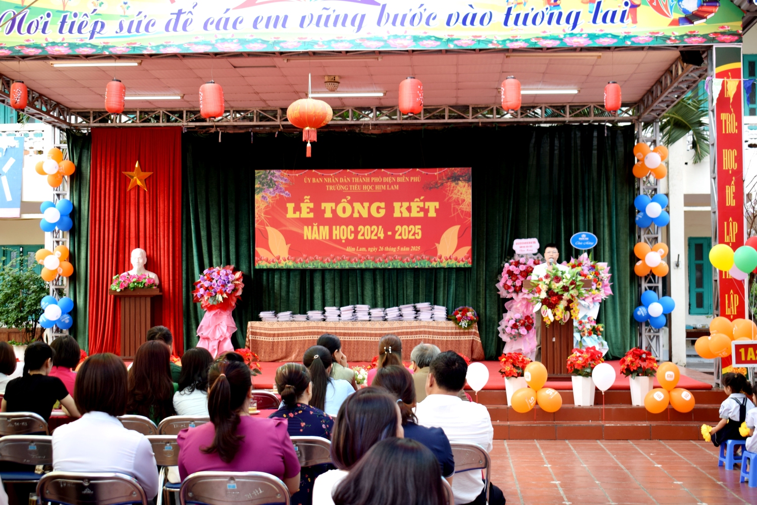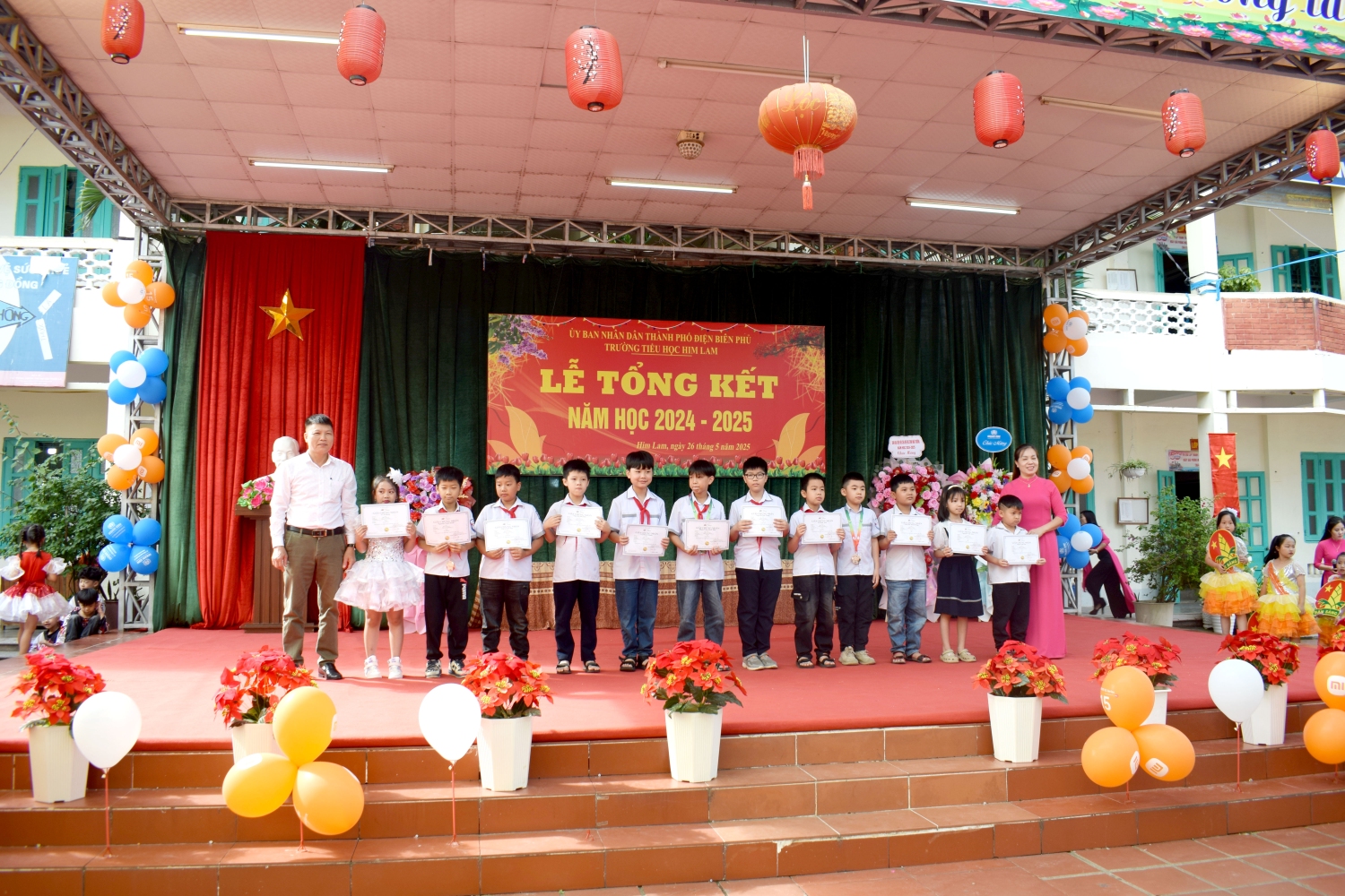 Tham dự Lễ tổng kết với thầy và trò nhà trường có bác Nguyễn Đình Tưởng- Phó Bí thư trường trực Đảng ủy, bác Vũ Thị Tuyêt Lan – Phó Chủ tịch Ủy ban nhân dân phường Him Lam, đại biểu lãnh đạo Đại đội 14- đơn vị kết nghĩa, đại biểu lãnh đạo các ban ngành, đoàn thể trên địa bàn TP Điện Biên Phủ, Ban ĐDCMHS nhà trường và Ban ĐDCMHS 28 lớp cùng toàn thể CBGVNV và 999 em học sinh. Năm học 2024-2025 kết thúc, với sự nỗ lực hết mình, thầy - trò nhà đã đạt được thành tích đáng khích lệ: 100% học sinh hoàn thành chương trình lớp học, hoàn thành chương trình Tiểu học; Có 100% học sinh hoàn thành tốt và hoàn thành các môn học và hoạt động giáo dục, 100% học sinh được xếp loại Tốt và Đạt về Năng lực và Phẩm chất. Trong đó có 41,3% học sinh đạt danh hiệu Học sinh xuất sắc; 34,6% học sinh đạt danh hiệu Học sinh tiêu biểu hoàn thành tốt trong học tập và rèn luyện. Trong cuộc thi: Thi giải Toán, Tiếng Anh, Trạng Nguyên Tiếng Việt qua Internet các cấp: Cấp trường có: 1099 giải, cấp TP có: 682 giải , cấp Tỉnh có: 298 giải. Trong đó có: 230 giải Nhất, 292 giải Nhì, 331 giải Ba, 246 giải Khuyến khích. Đặc biệt: Thi môn Toán cấp quốc gia: có 12 em đạt giải. Trong đó: 1 giải Bạc, 2 giải Đồng, 9 giải Khuyến khích. Thi sáng tạo thanh thiếu nhi cấp thành phố năm 2025, có 01 sản phảm đạt giải C. Thi Thể thao cấp Tỉnh: bóng bàn: 01 nhì; pickleball: 02 nhì, 03 ba; cờ vua: 01 nhất. Tham gia Lễ hội Hoa Anh Đào, Lễ hội Hoa Ban năm 2025, nhà trường đã tạo được dấu ấn nổi bật với các nội dung: Văn nghệ, gian hàng và diễu hành. Trong bài phát biểu diễn văn tổng kết năm học 2024-2025, cô giáo Nguyễn Thị Bích- Bí thư chi bộ- Hiệu trưởng nhà trường đã thay mặt Cấp ủy Chi bộ, BGH ghi nhận sự đoàn kết, thống nhất, cộng đồng trách nhiệm, tinh thần nỗ lực phấn đấu không ngừng của tập thể CBGVNV và các em học sinh nhà trường trong việc thực hiện nhiệm vụ năm học, nâng cao chất lượng giáo dục toàn diện, biểu dương và chúc mừng thành tích xuất sắc của tập thể CBGVNV và các em học sinh đã đạt được trong năm học qua. Đồng thời bày tỏ lòng biết ơn trân thành và sâu sắc tới các cấp lãnh đạo ngành giáo dục, chính quyền địa phương, toàn thể các bậc phụ huynh trong năm học đã luôn quan tâm, chỉ đạo sâu sát, tạo mọi điều kiện, giúp đỡ to lớn cả về tinh thần và vật chất cho thầy và trò nhà trường thực hiện xuất sắc nhiệm vụ năm học.