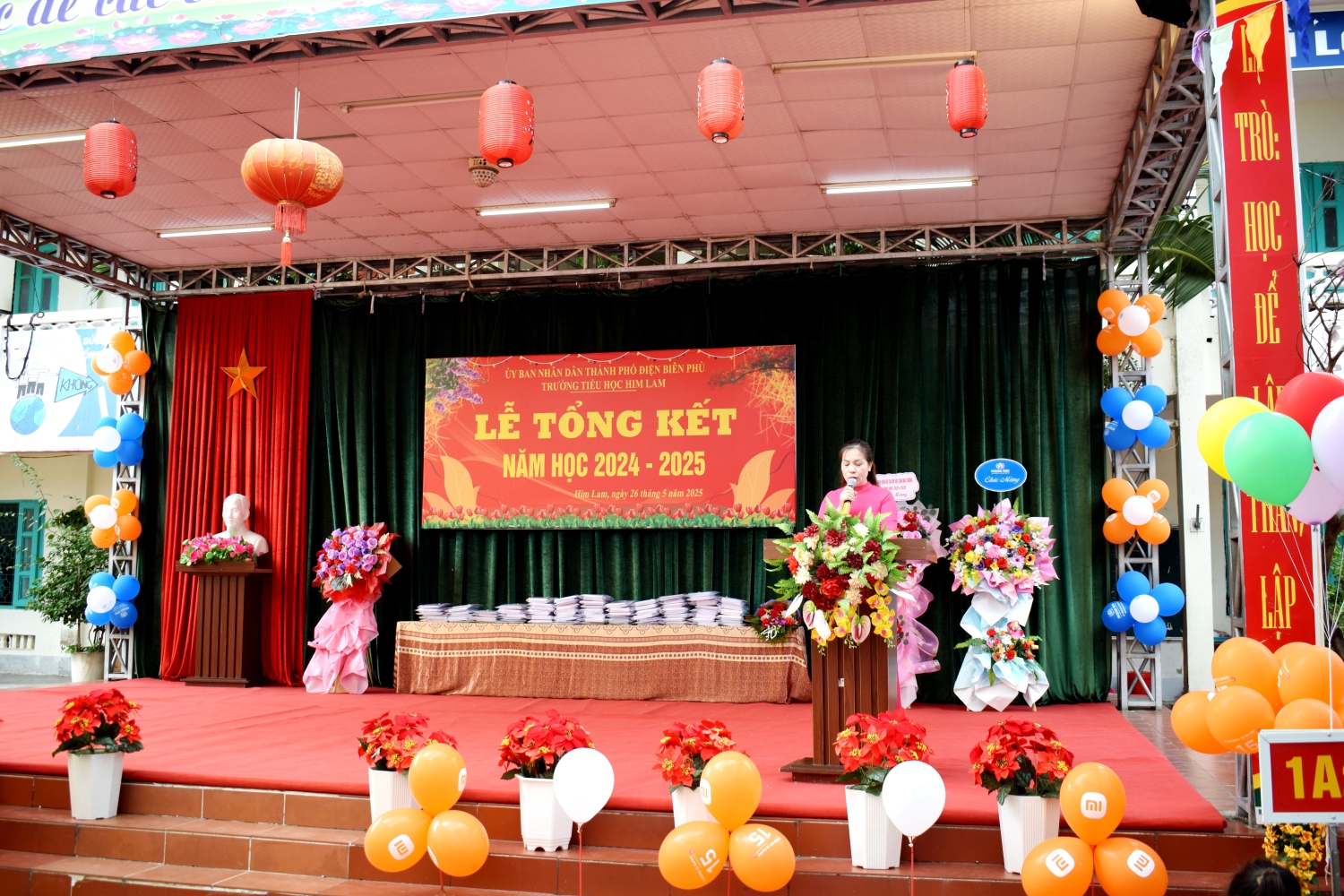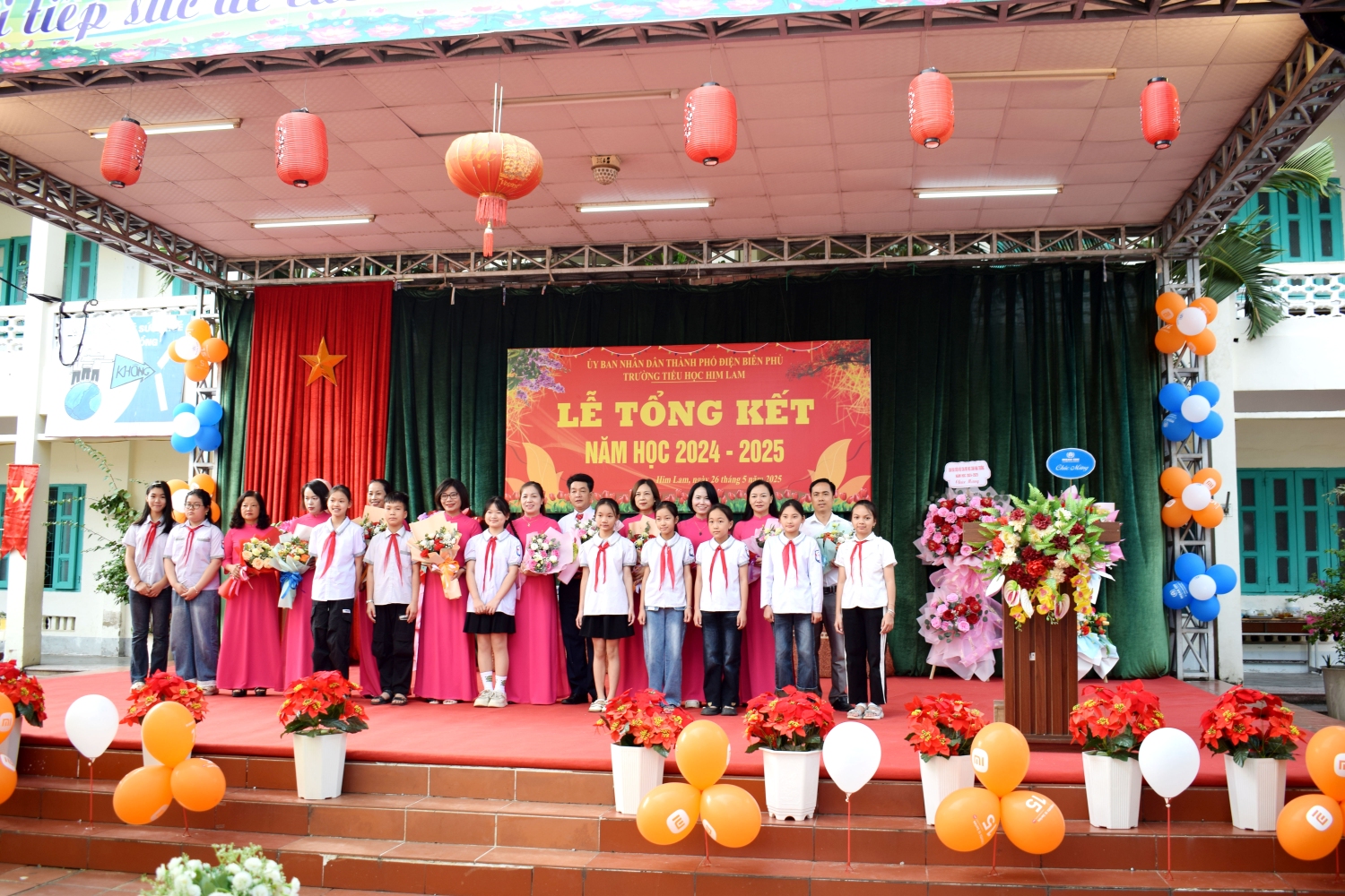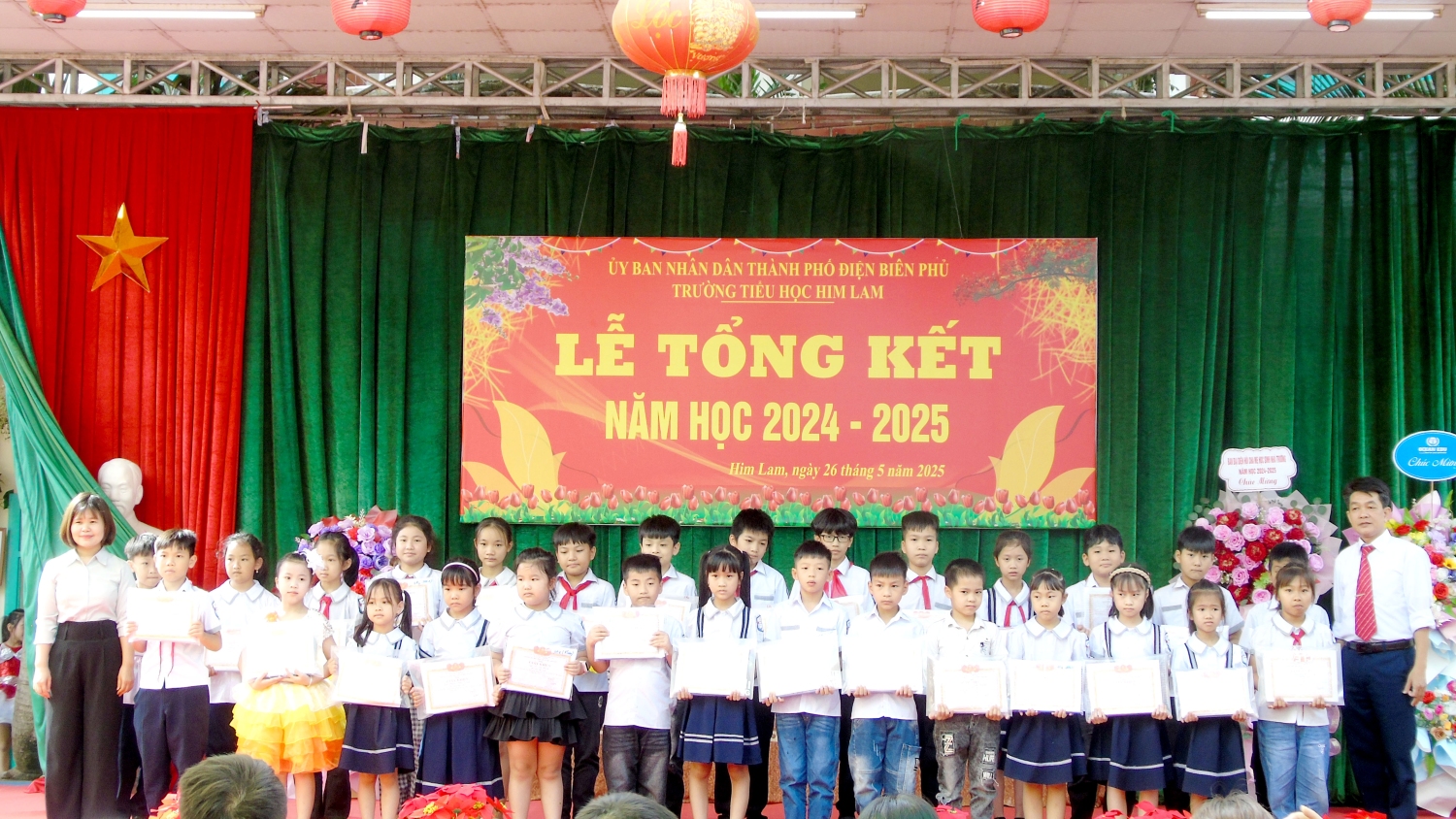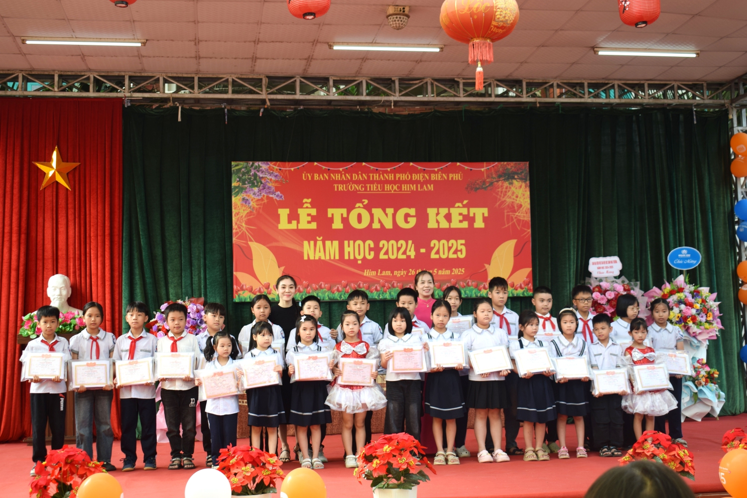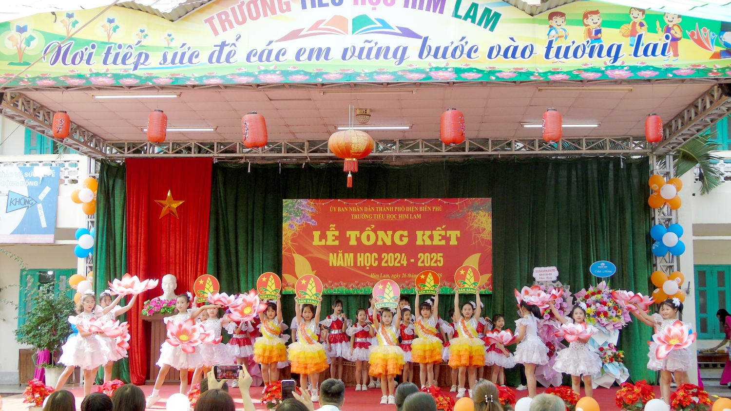 Tham dự Lễ tổng kết với thầy và trò nhà trường có bác Nguyễn Đình Tưởng- Phó Bí thư trường trực Đảng ủy, bác Vũ Thị Tuyêt Lan – Phó Chủ tịch Ủy ban nhân dân phường Him Lam, đại biểu lãnh đạo Đại đội 14- đơn vị kết nghĩa, đại biểu lãnh đạo các ban ngành, đoàn thể trên địa bàn TP Điện Biên Phủ, Ban ĐDCMHS nhà trường và Ban ĐDCMHS 28 lớp cùng toàn thể CBGVNV và 999 em học sinh. Năm học 2024-2025 kết thúc, với sự nỗ lực hết mình, thầy - trò nhà đã đạt được thành tích đáng khích lệ: 100% học sinh hoàn thành chương trình lớp học, hoàn thành chương trình Tiểu học; Có 100% học sinh hoàn thành tốt và hoàn thành các môn học và hoạt động giáo dục, 100% học sinh được xếp loại Tốt và Đạt về Năng lực và Phẩm chất. Trong đó có 41,3% học sinh đạt danh hiệu Học sinh xuất sắc; 34,6% học sinh đạt danh hiệu Học sinh tiêu biểu hoàn thành tốt trong học tập và rèn luyện. Trong cuộc thi: Thi giải Toán, Tiếng Anh, Trạng Nguyên Tiếng Việt qua Internet các cấp: Cấp trường có: 1099 giải, cấp TP có: 682 giải , cấp Tỉnh có: 298 giải. Trong đó có: 230 giải Nhất, 292 giải Nhì, 331 giải Ba, 246 giải Khuyến khích. Đặc biệt: Thi môn Toán cấp quốc gia: có 12 em đạt giải. Trong đó: 1 giải Bạc, 2 giải Đồng, 9 giải Khuyến khích. Thi sáng tạo thanh thiếu nhi cấp thành phố năm 2025, có 01 sản phảm đạt giải C. Thi Thể thao cấp Tỉnh: bóng bàn: 01 nhì; pickleball: 02 nhì, 03 ba; cờ vua: 01 nhất. Tham gia Lễ hội Hoa Anh Đào, Lễ hội Hoa Ban năm 2025, nhà trường đã tạo được dấu ấn nổi bật với các nội dung: Văn nghệ, gian hàng và diễu hành. Trong bài phát biểu diễn văn tổng kết năm học 2024-2025, cô giáo Nguyễn Thị Bích- Bí thư chi bộ- Hiệu trưởng nhà trường đã thay mặt Cấp ủy Chi bộ, BGH ghi nhận sự đoàn kết, thống nhất, cộng đồng trách nhiệm, tinh thần nỗ lực phấn đấu không ngừng của tập thể CBGVNV và các em học sinh nhà trường trong việc thực hiện nhiệm vụ năm học, nâng cao chất lượng giáo dục toàn diện, biểu dương và chúc mừng thành tích xuất sắc của tập thể CBGVNV và các em học sinh đã đạt được trong năm học qua. Đồng thời bày tỏ lòng biết ơn trân thành và sâu sắc tới các cấp lãnh đạo ngành giáo dục, chính quyền địa phương, toàn thể các bậc phụ huynh trong năm học đã luôn quan tâm, chỉ đạo sâu sát, tạo mọi điều kiện, giúp đỡ to lớn cả về tinh thần và vật chất cho thầy và trò nhà trường thực hiện xuất sắc nhiệm vụ năm học.