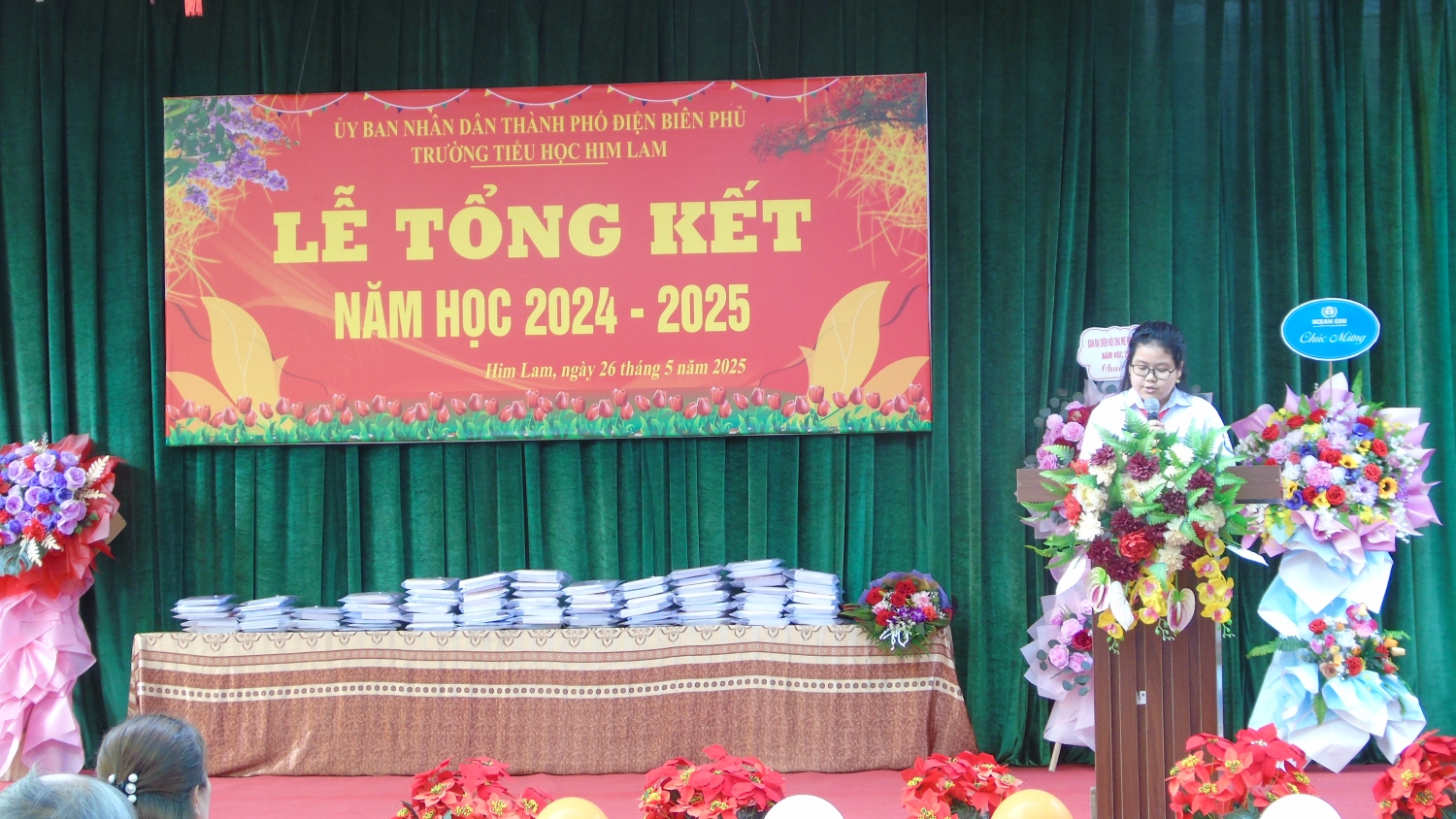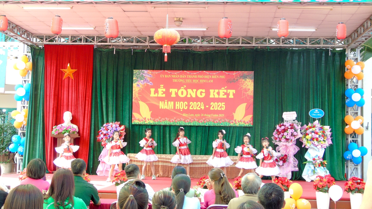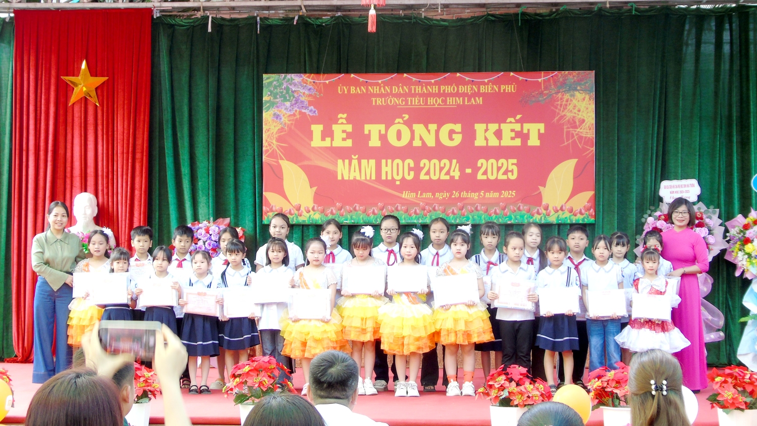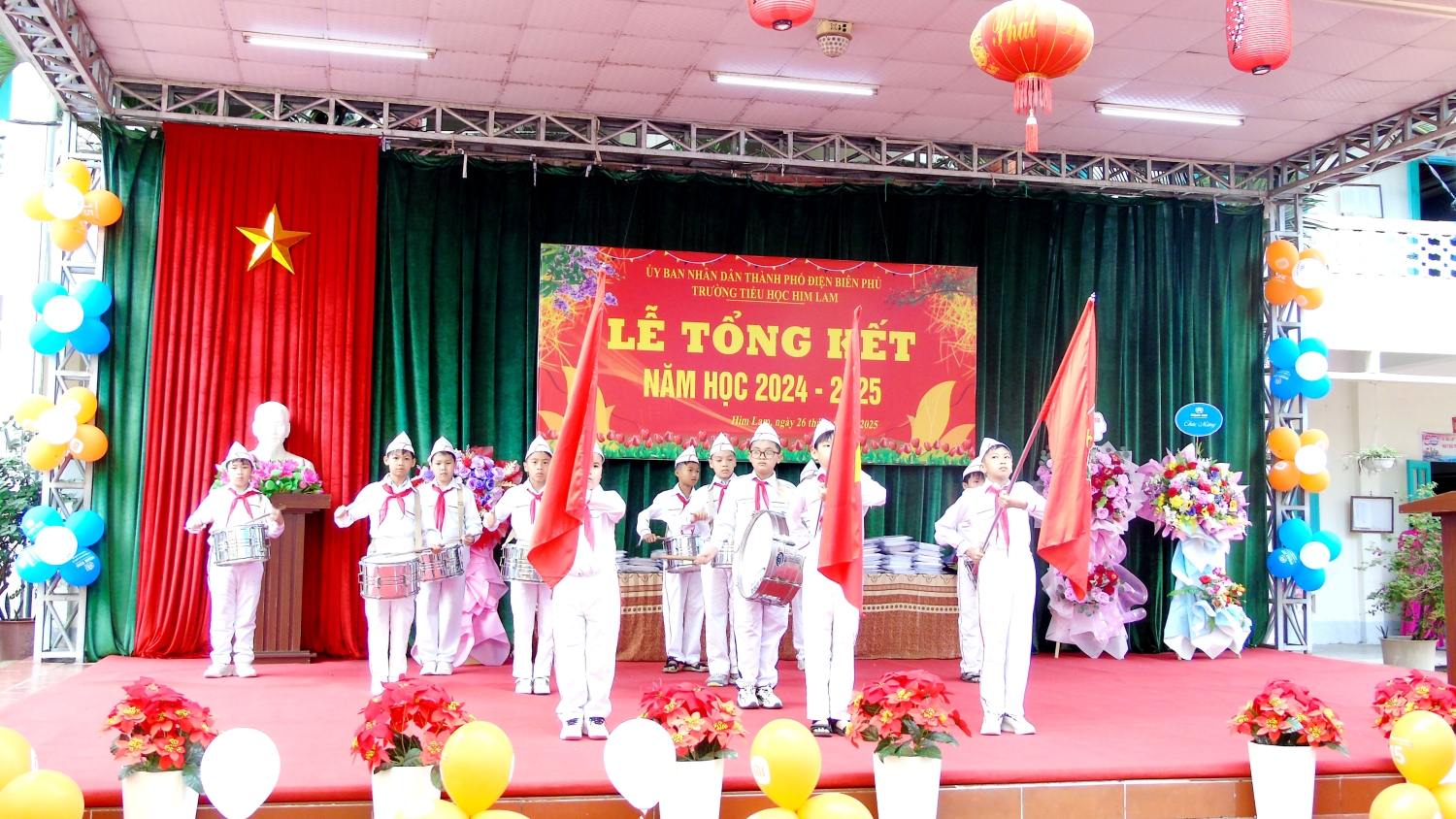 Tham dự Lễ tổng kết với thầy và trò nhà trường có bác Nguyễn Đình Tưởng- Phó Bí thư trường trực Đảng ủy, bác Vũ Thị Tuyêt Lan – Phó Chủ tịch Ủy ban nhân dân phường Him Lam, đại biểu lãnh đạo Đại đội 14- đơn vị kết nghĩa, đại biểu lãnh đạo các ban ngành, đoàn thể trên địa bàn TP Điện Biên Phủ, Ban ĐDCMHS nhà trường và Ban ĐDCMHS 28 lớp cùng toàn thể CBGVNV và 999 em học sinh. Năm học 2024-2025 kết thúc, với sự nỗ lực hết mình, thầy - trò nhà đã đạt được thành tích đáng khích lệ: 100% học sinh hoàn thành chương trình lớp học, hoàn thành chương trình Tiểu học; Có 100% học sinh hoàn thành tốt và hoàn thành các môn học và hoạt động giáo dục, 100% học sinh được xếp loại Tốt và Đạt về Năng lực và Phẩm chất. Trong đó có 41,3% học sinh đạt danh hiệu Học sinh xuất sắc; 34,6% học sinh đạt danh hiệu Học sinh tiêu biểu hoàn thành tốt trong học tập và rèn luyện. Trong cuộc thi: Thi giải Toán, Tiếng Anh, Trạng Nguyên Tiếng Việt qua Internet các cấp: Cấp trường có: 1099 giải, cấp TP có: 682 giải , cấp Tỉnh có: 298 giải. Trong đó có: 230 giải Nhất, 292 giải Nhì, 331 giải Ba, 246 giải Khuyến khích. Đặc biệt: Thi môn Toán cấp quốc gia: có 12 em đạt giải. Trong đó: 1 giải Bạc, 2 giải Đồng, 9 giải Khuyến khích. Thi sáng tạo thanh thiếu nhi cấp thành phố năm 2025, có 01 sản phảm đạt giải C. Thi Thể thao cấp Tỉnh: bóng bàn: 01 nhì; pickleball: 02 nhì, 03 ba; cờ vua: 01 nhất. Tham gia Lễ hội Hoa Anh Đào, Lễ hội Hoa Ban năm 2025, nhà trường đã tạo được dấu ấn nổi bật với các nội dung: Văn nghệ, gian hàng và diễu hành. Trong bài phát biểu diễn văn tổng kết năm học 2024-2025, cô giáo Nguyễn Thị Bích- Bí thư chi bộ- Hiệu trưởng nhà trường đã thay mặt Cấp ủy Chi bộ, BGH ghi nhận sự đoàn kết, thống nhất, cộng đồng trách nhiệm, tinh thần nỗ lực phấn đấu không ngừng của tập thể CBGVNV và các em học sinh nhà trường trong việc thực hiện nhiệm vụ năm học, nâng cao chất lượng giáo dục toàn diện, biểu dương và chúc mừng thành tích xuất sắc của tập thể CBGVNV và các em học sinh đã đạt được trong năm học qua. Đồng thời bày tỏ lòng biết ơn trân thành và sâu sắc tới các cấp lãnh đạo ngành giáo dục, chính quyền địa phương, toàn thể các bậc phụ huynh trong năm học đã luôn quan tâm, chỉ đạo sâu sát, tạo mọi điều kiện, giúp đỡ to lớn cả về tinh thần và vật chất cho thầy và trò nhà trường thực hiện xuất sắc nhiệm vụ năm học.