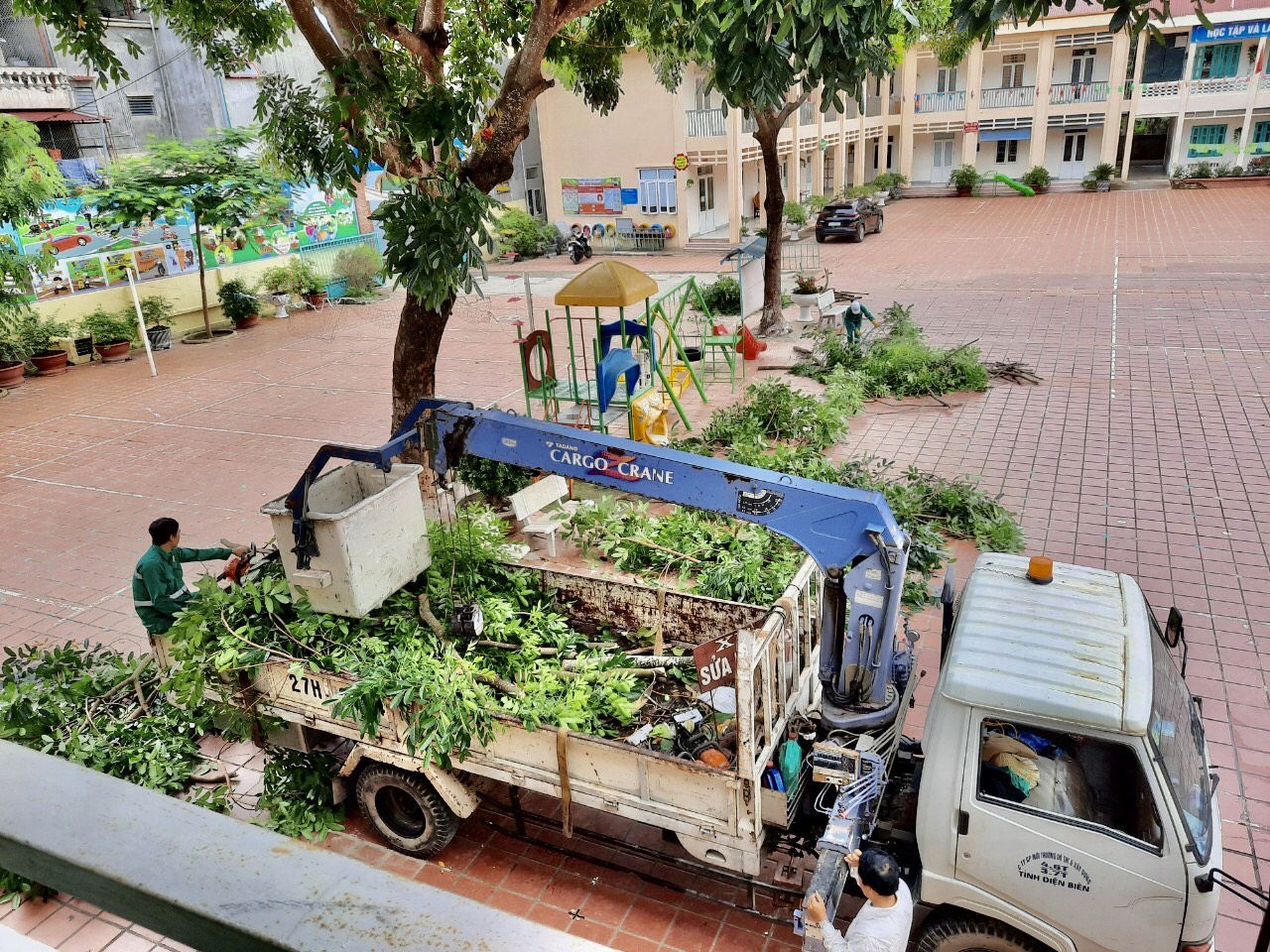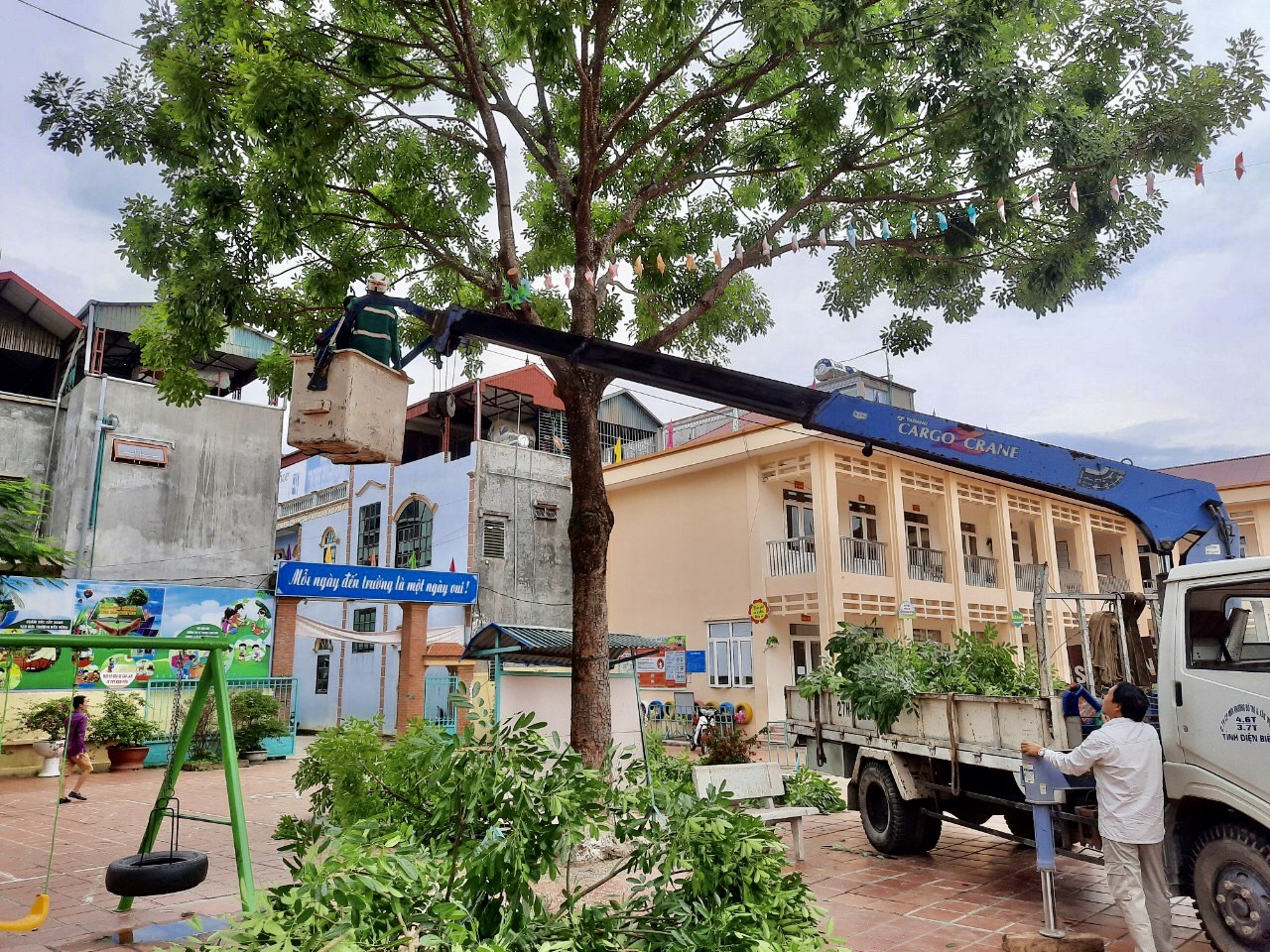 Nhà trường phối hợp với Công ty cổ phần Môi trường đô thị và xây dựng Điện Biên kiểm tra, rà soát hệ thống cây xanh trong khuôn viên nhà trường, cắt tỉa, xử lý các cây xanh có nguy cơ gãy đổ nhằm đảm bảo an toàn tuyệt đối cho cán bộ, giáo viên, nhân viên và học sinh.